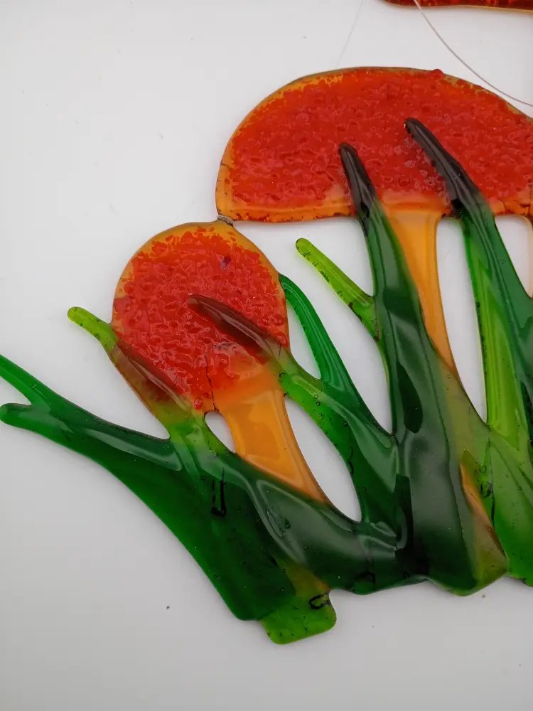 It's a fabulous fused glass mushroom suncatcher with a fishing line attached for hanging. It's in excellent vintage condition with no chips or cracks and a complete but faded sticker.