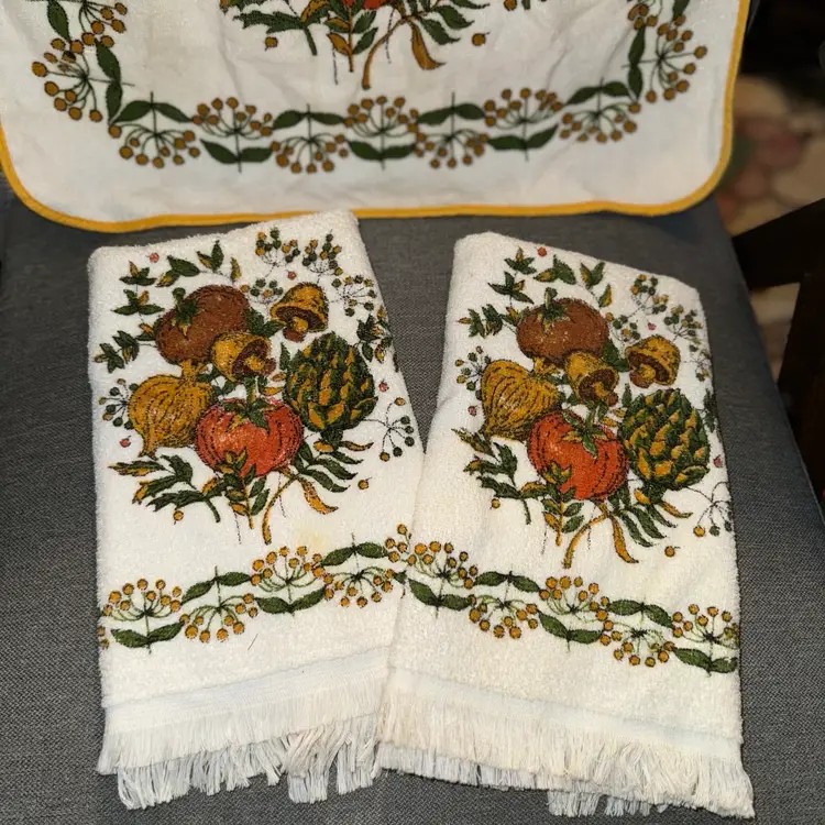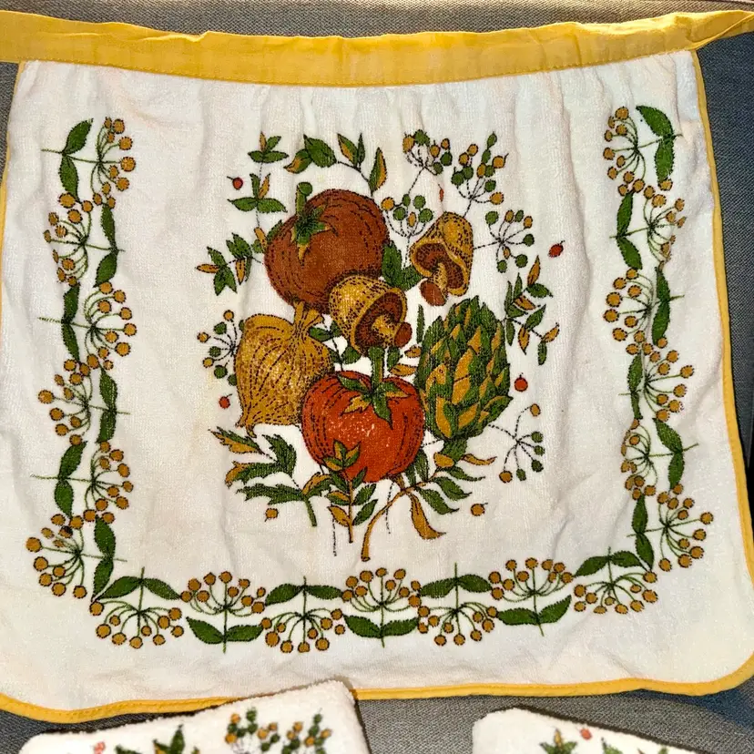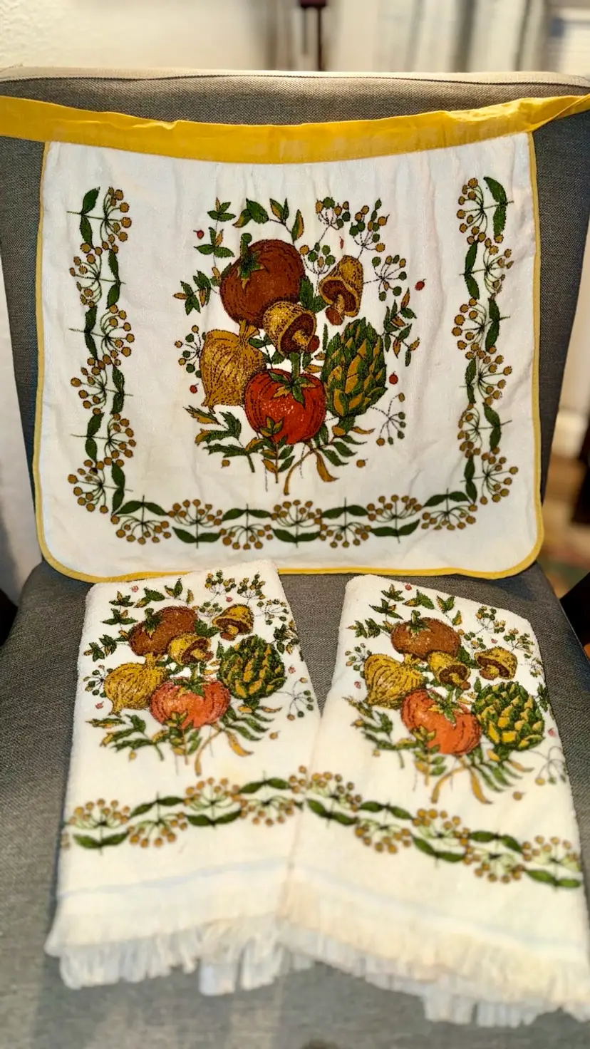 NWOT/dead stock Vintage Cannon/ J.C. Penney Mushroom and veggie towels and apron set Towels measure 15.5x24 Apron front is 21” W by 18” H