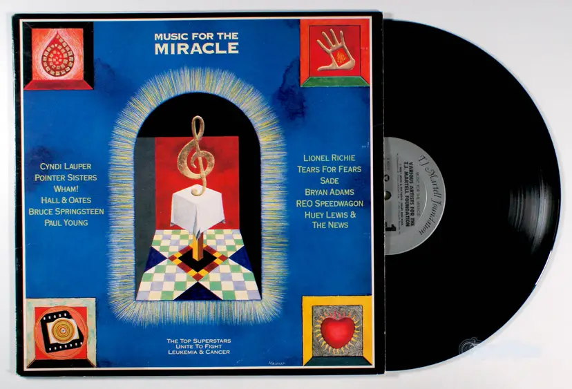 Music For The Miracle by various artists is a charity compilation album featuring an eclectic mix of hit songs by 1980s stars including Huey Lewis & The News, Daryl Hall & John Oates, Lionel Richie, George Michael, Sade, Bruce Springsteen, The Pointer Sisters, Cyndi Lauper, Tears for Fears, REO Speedwagon, and Paul Young, among others, all to benefit the T.J. Martell Foundation's fight against leukemia and cancer. A unique and interesting fact is that the entire album was recorded in an astonishing single 11-hour session at New York City's Sigma Sound Studios, showcasing the music industry's rapid mobilization for a cause. Historically significant as one of the earliest major benefit projects spotlighting leukemia and cancer research through celebrity collaboration, it captured the era's spirit of communal support amid rising health crises. Popular songs and fan-favorites from the tracklist include the high-energy Heart And Soul by Huey Lewis & The News, the synth-pop staple Out Of Touch by Daryl Hall & John Oates, Cyndi Lauper's playful She Bop, and the soulful Careless Whisper by George Michael. Though the album achieved no chart success and remains a limited-edition collector's gem, its legacy endures among 80s music and charity album aficionados.