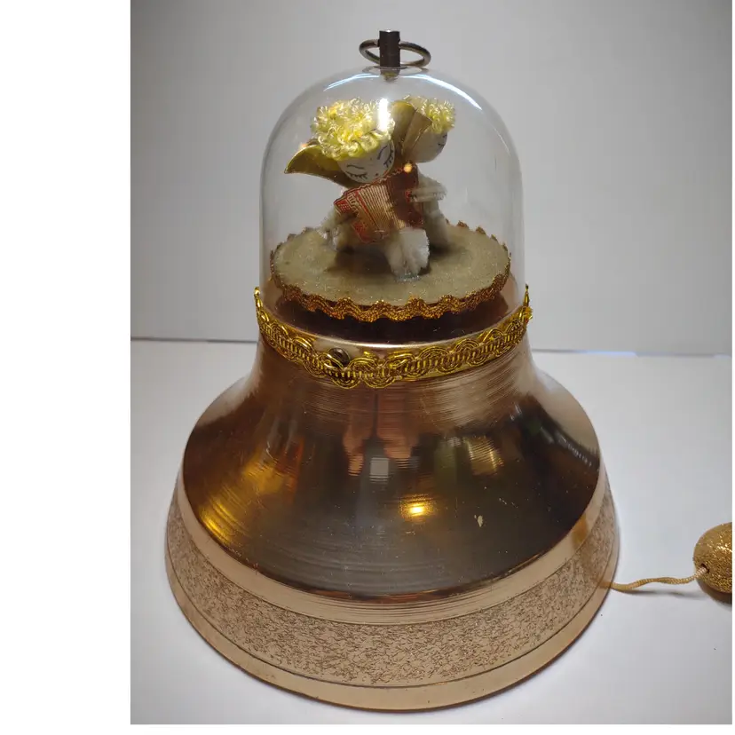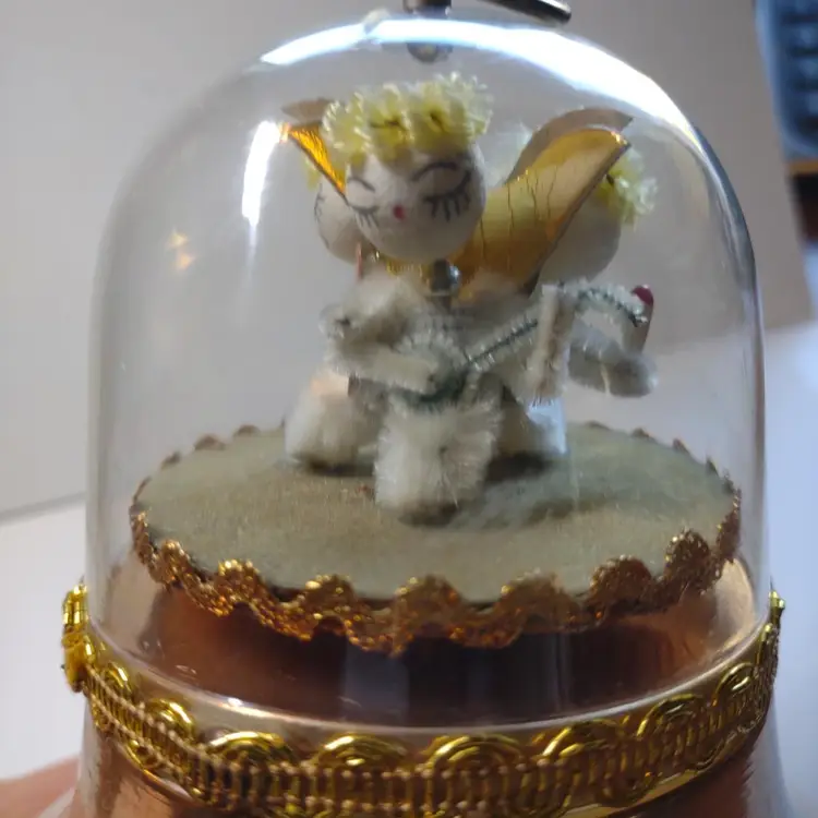 DAMAGED DOME WITH HAIRLINES. Plays the song Silent Night. Vintage 6" tall 5.75" wide working musical Christmas ornament. Has revolving angels in the top plastic dome who are playing instruments. They are made of fabrics. The dome has some hairline cracks. The fabrics on the edge have some wear. Pull the cord and it plays the song and spins around.