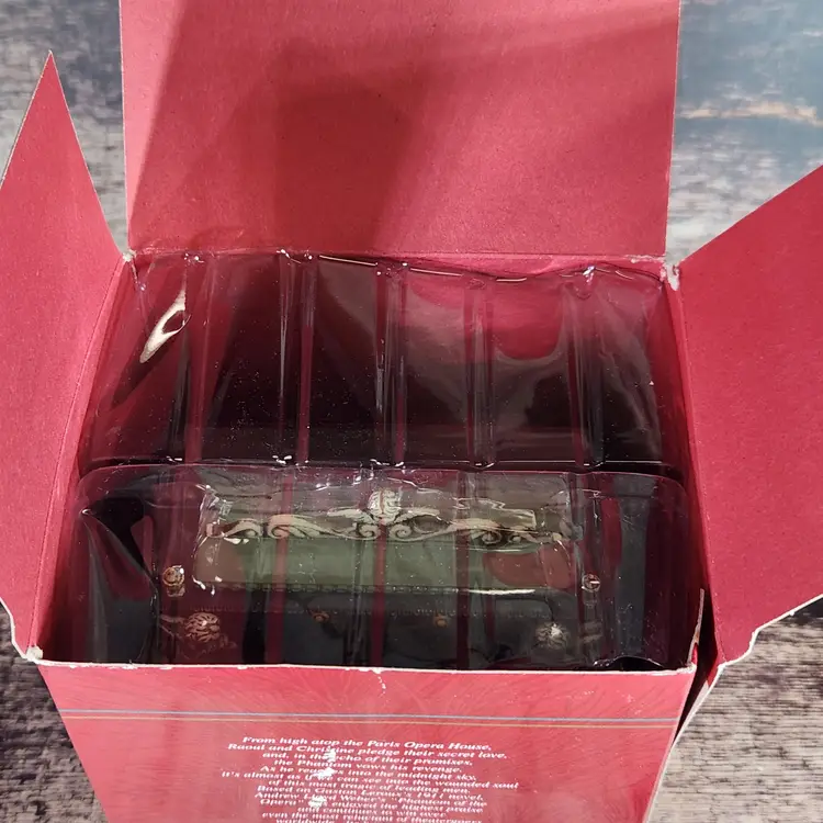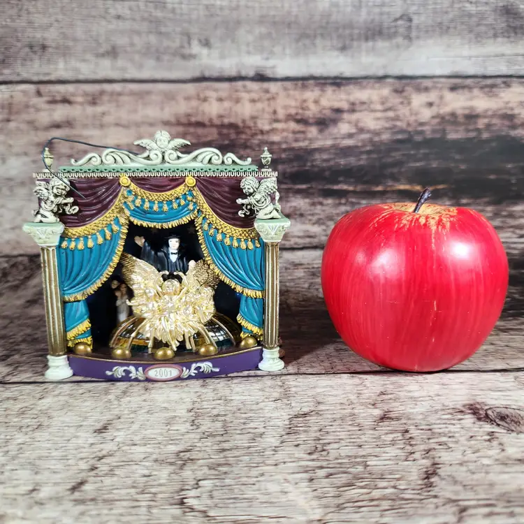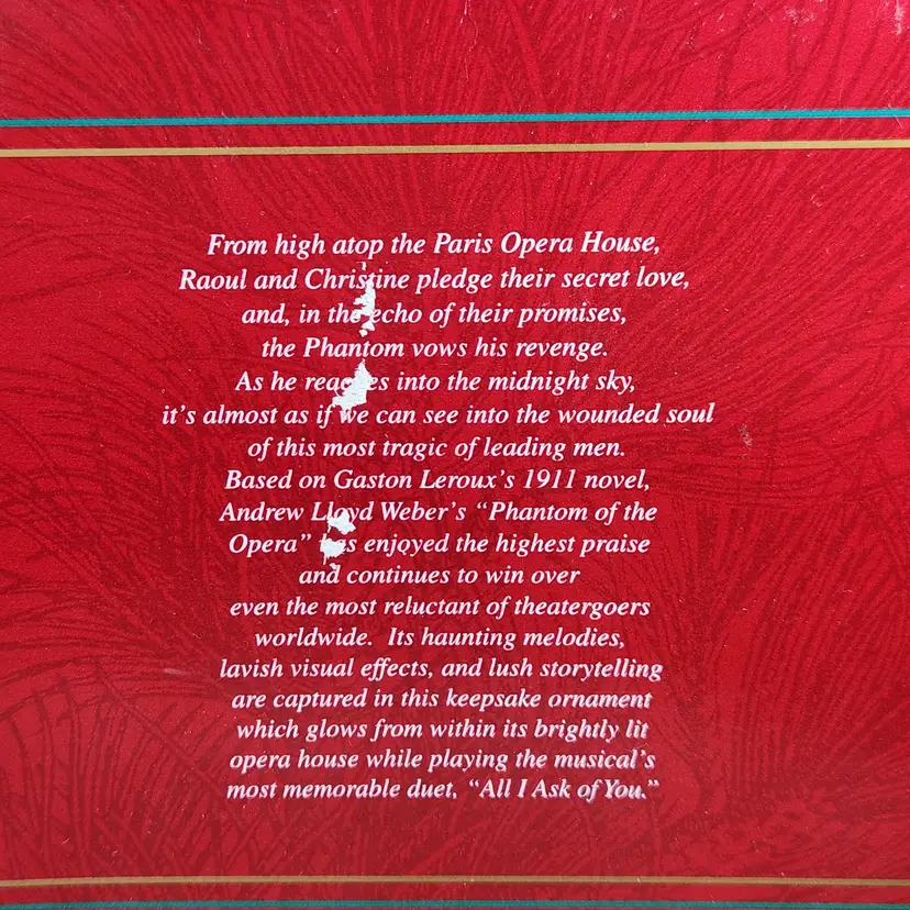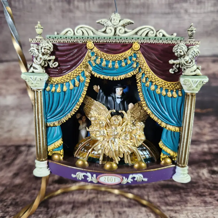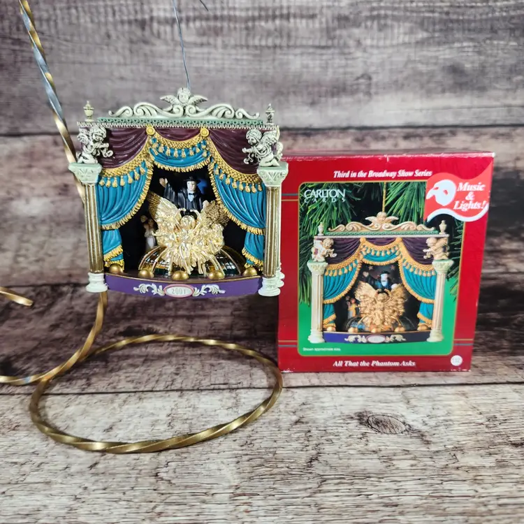 Working light up 2001 Phantom of the Opera ornament by Carlton Cards. This plays the signature song from the show, "All I Ask of You". Has been tested and works. Runs on 3 AAA batteries. Comes with original box and inserts. Lighting changes color depending on the character singing. This is number 3 in the series. I have other musical ornaments listed so please check my other listings.