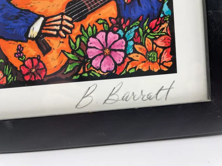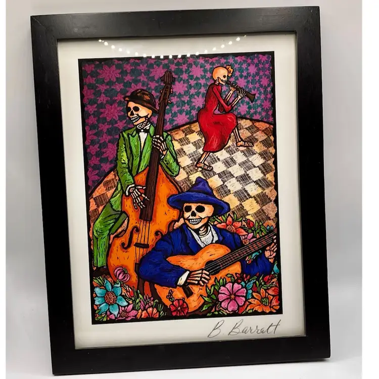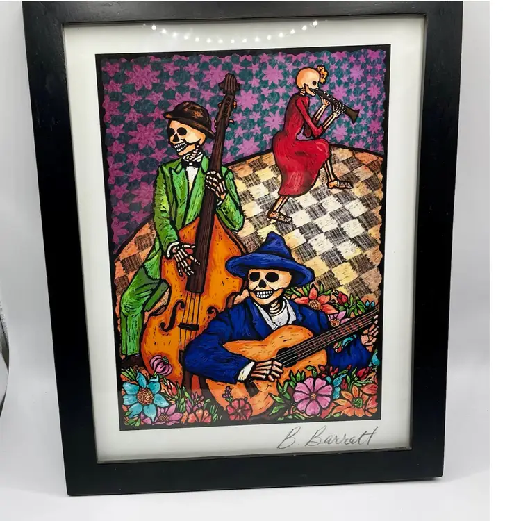 This product is a framed, signed print featuring Dia De Los Muertos themed music-related artwork by Barbara Barratt. The piece celebrates the Mexican culture and tradition of the Day of the Dead, with a focus on musicians and skeletons. Made in the United States, this collectible item adds a unique and artistic touch to any space, especially during the festive occasion of the Day of the Dead.