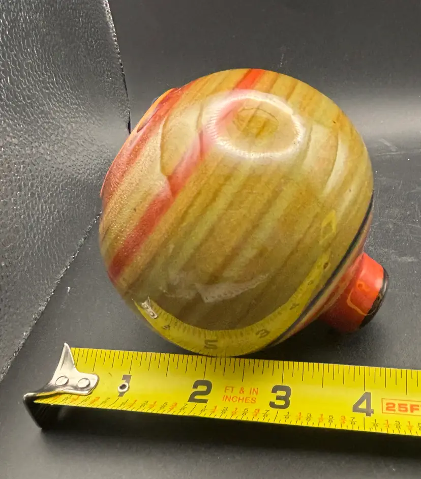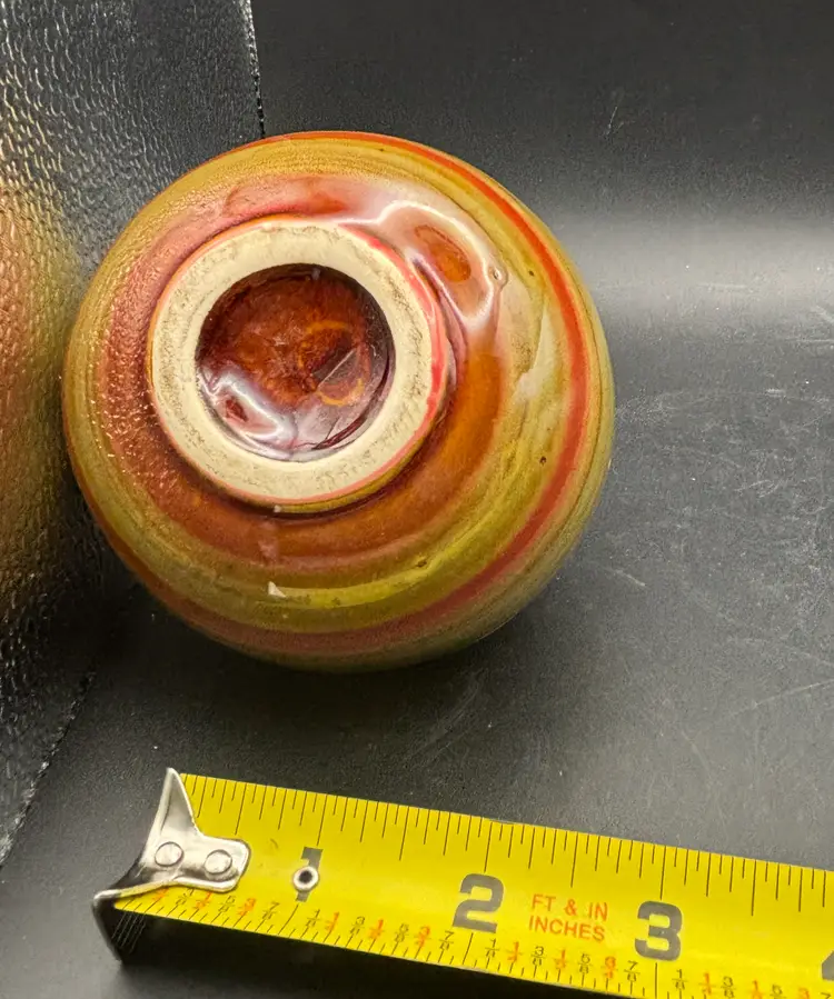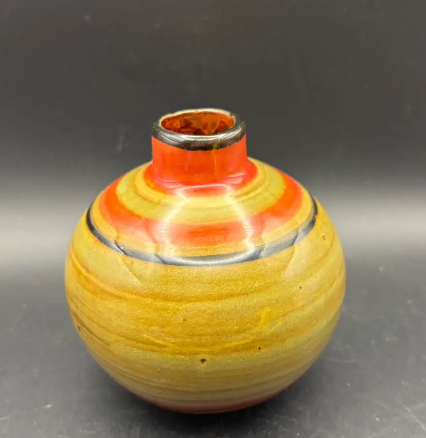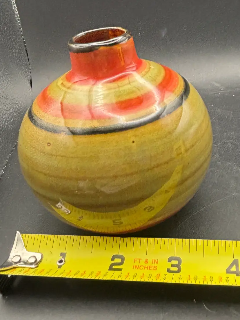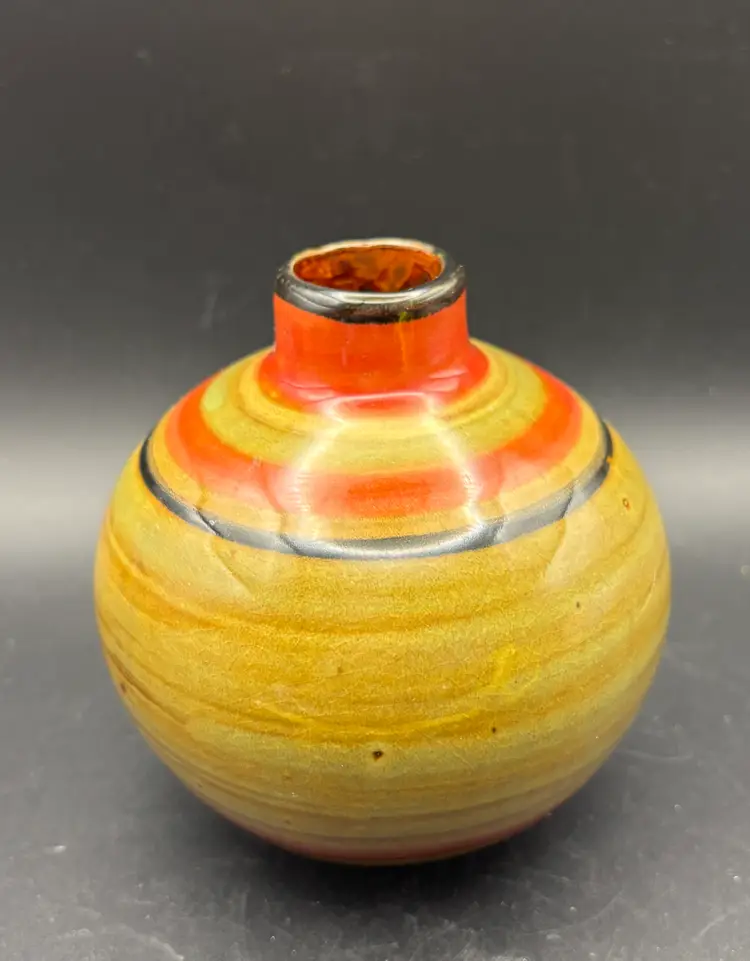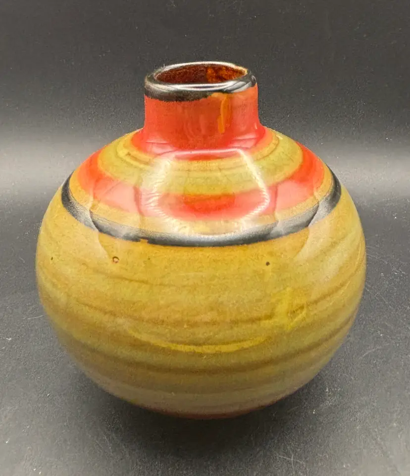 Sweet little MCM vase in mustard yellow and red. See photos for condition and measurements. No Signature or history known. Colors are bright and clear,
