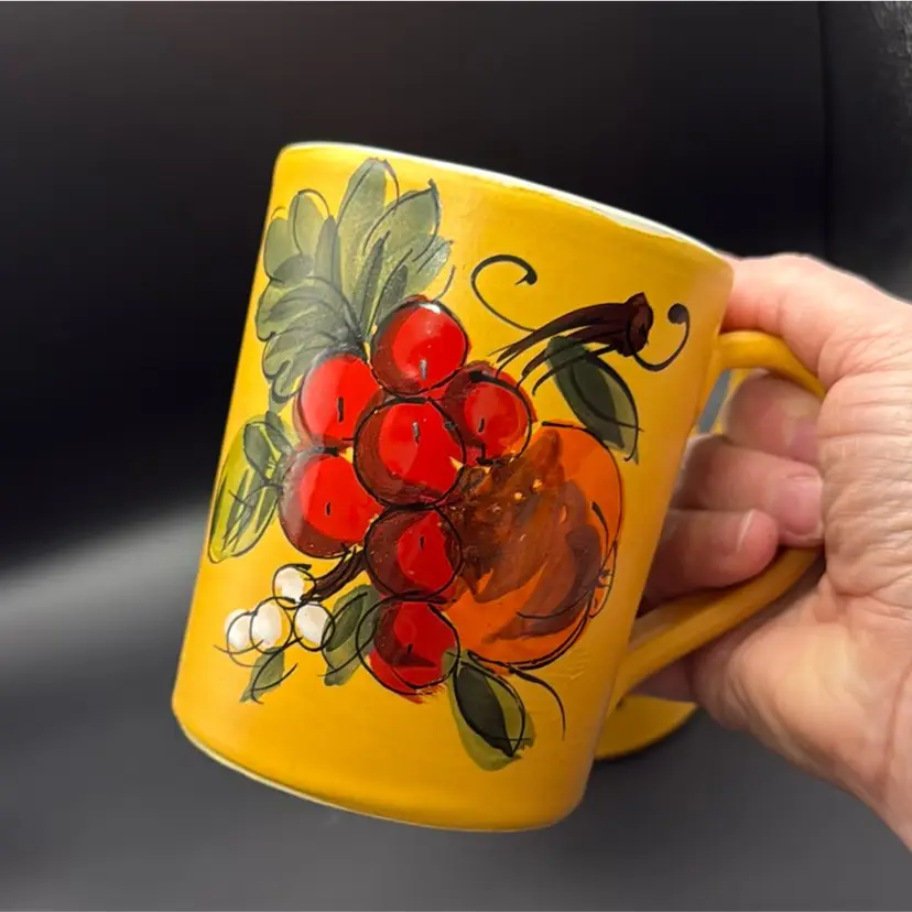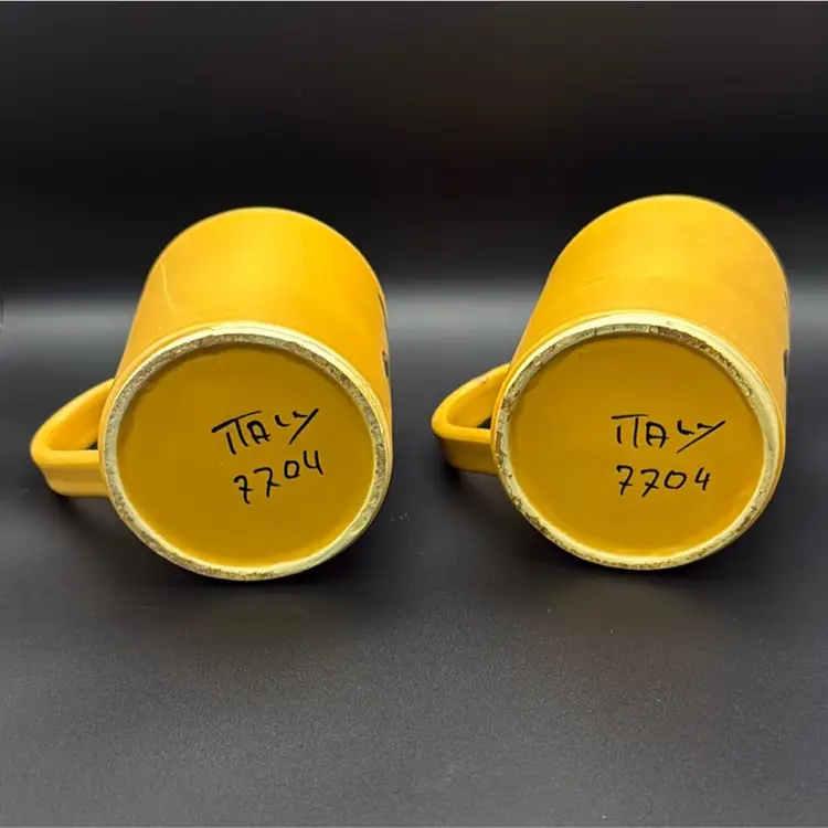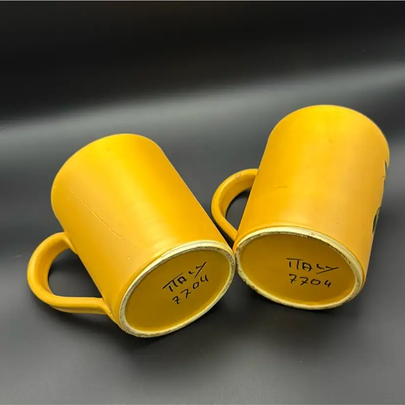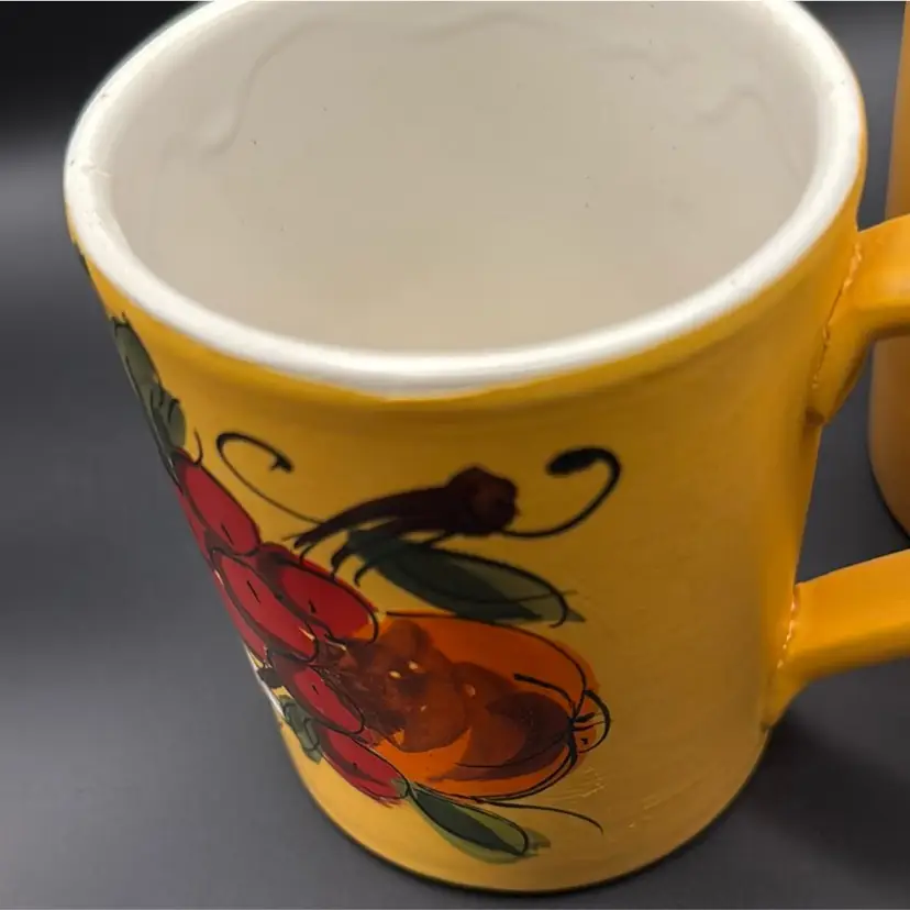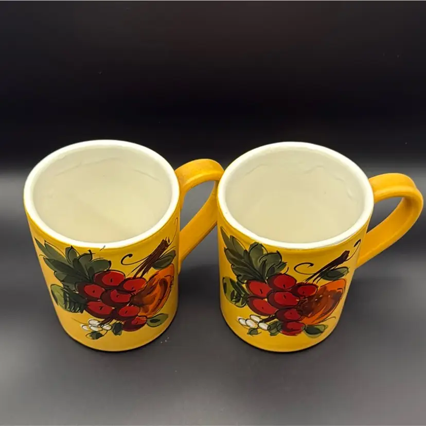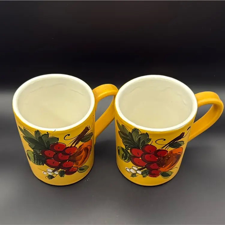 Set of two beautifully hand painted mugs that hold about 12oz. Matte finish on yellow flowers have gloss. Height: 4 inches Circumference: 10 inches Width: 3 inches