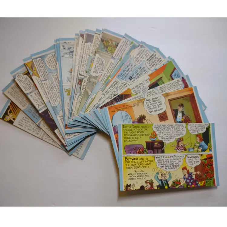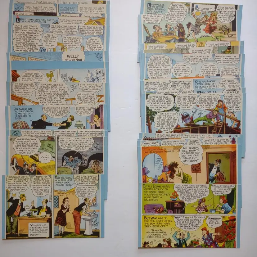 Original vintage complete set of (32) different Mutoscope arcade penny arcade cards. Made for the amusement arcade vending machines back in the day. These have comic artwork by and are signed Jimmy Hatlo. Amazing condition old unused stock. Some light corner dings to some of the cards. None were ever used and been in storage all these years. Size is 5.25" x 3.25" on thick card stock. Some cards show the card number in the series. Some do not. Some are marked Louis F. Dow Co. and King Features Syndicate. Little Iodine a popular comic strip character is featured on some of the cards.
