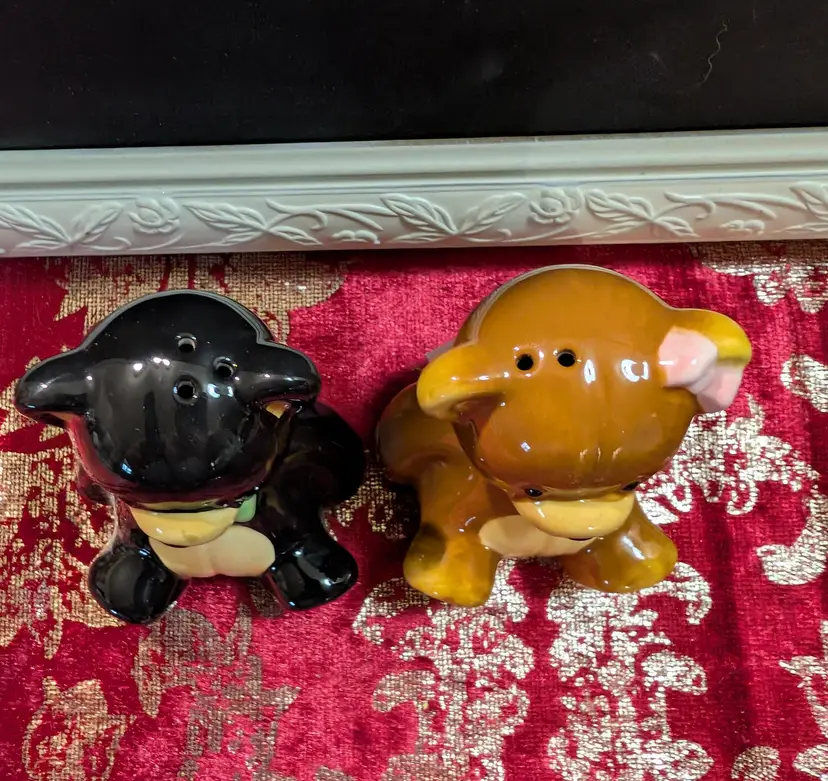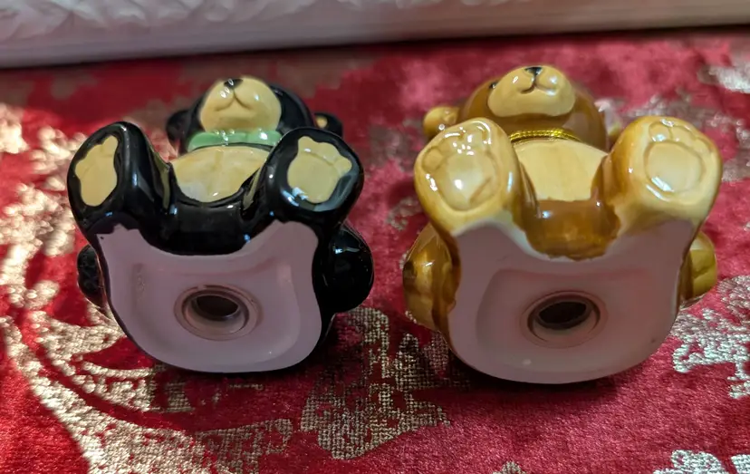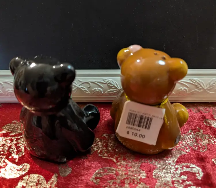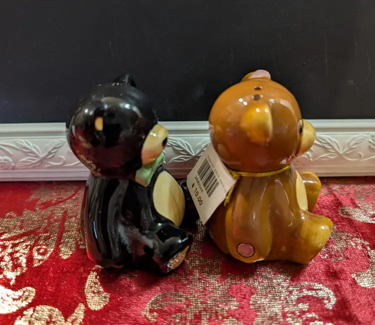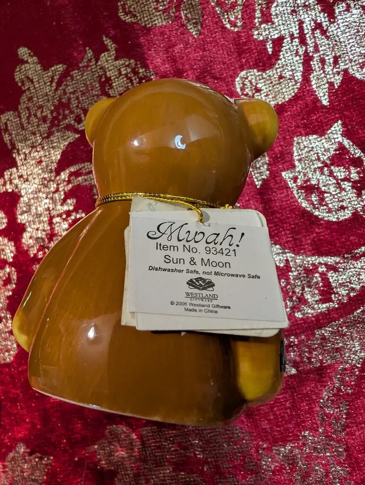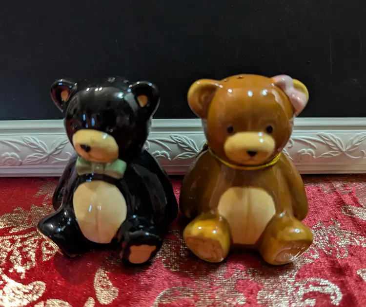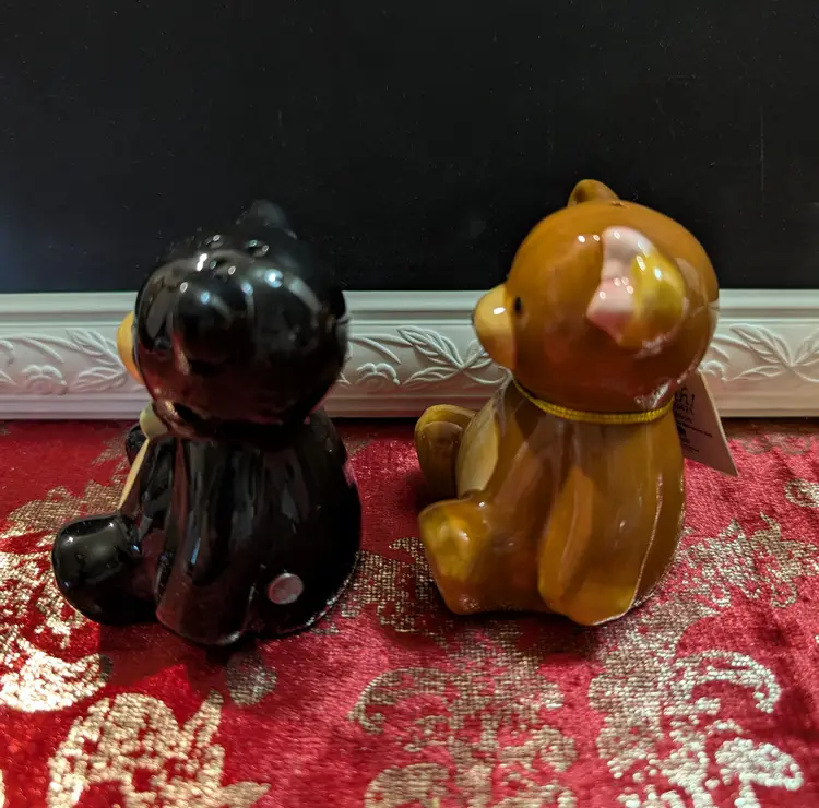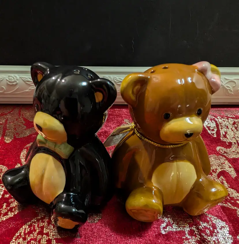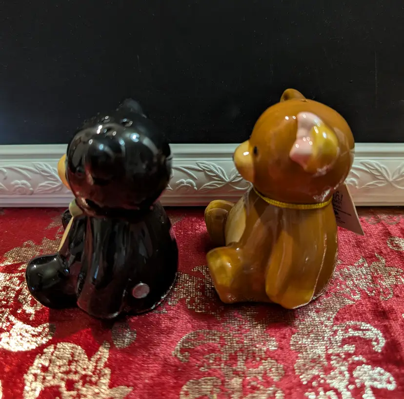 Mwah Teddy bear salt and pepper shakers from Westland giftware. Salt and pepper shakers are in excellent condition with no chips or cracks and no crazy and look brand new. Shakers have original tag and our dishwasher safe but would recommend hand wash only. Salt and pepper shakers are approximately 3 in height and 2 in width. Very cute pair of shakers that are magnetized and stick together on the side of the shakers. These are perfect for a country style setting design or cabin design. Perfect for bear lovers.