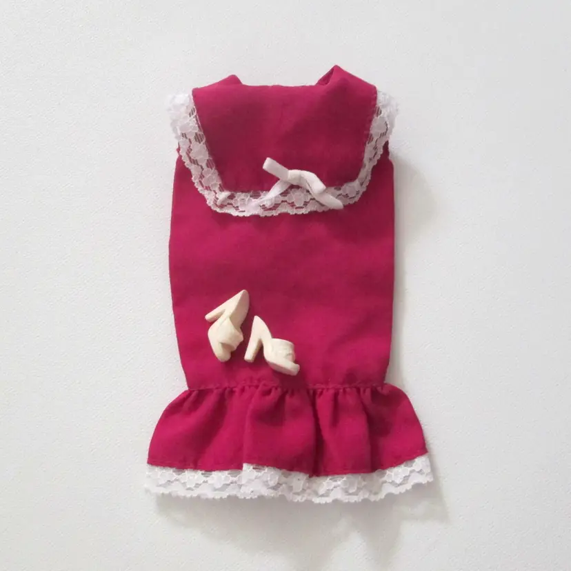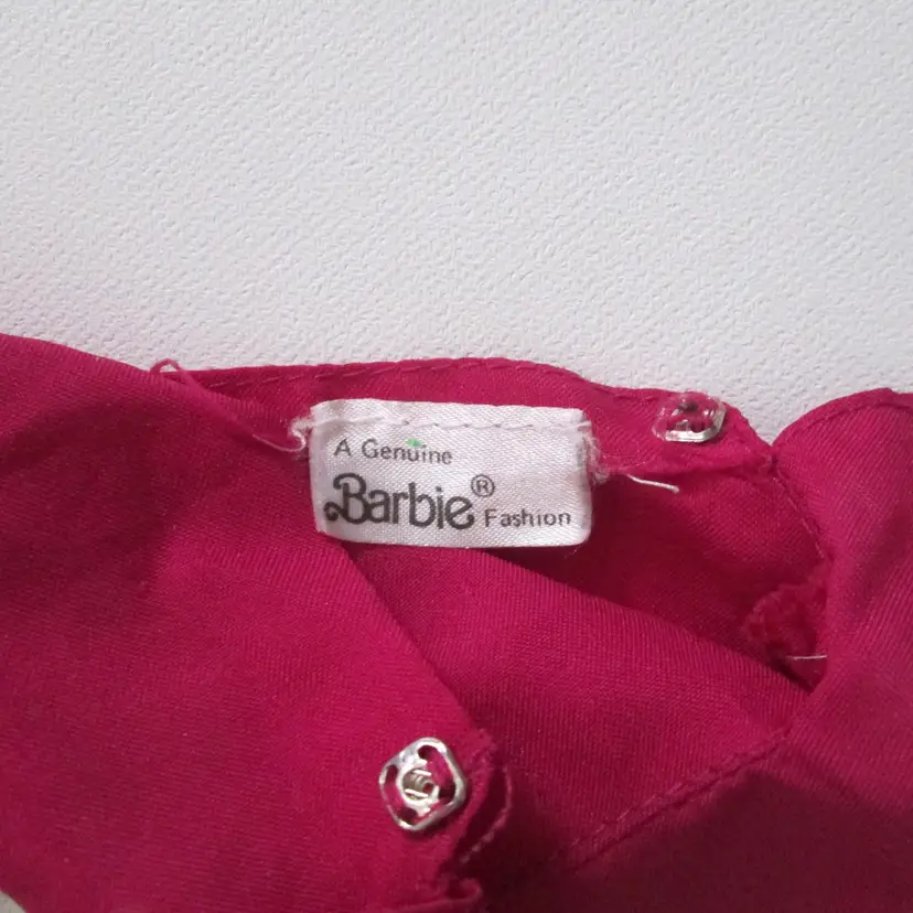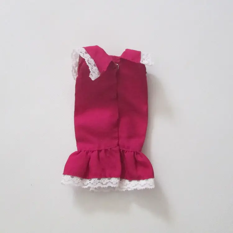 My First Barbie Easy On 7920 fashion from 1984. Maroon dress with ruffle bottom and lace trim Includes a pair of open toe white shoes Easy to dress outfit, closes with only one snap. Has 80s style fabric Barbie tag.