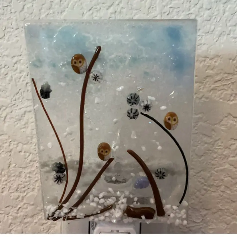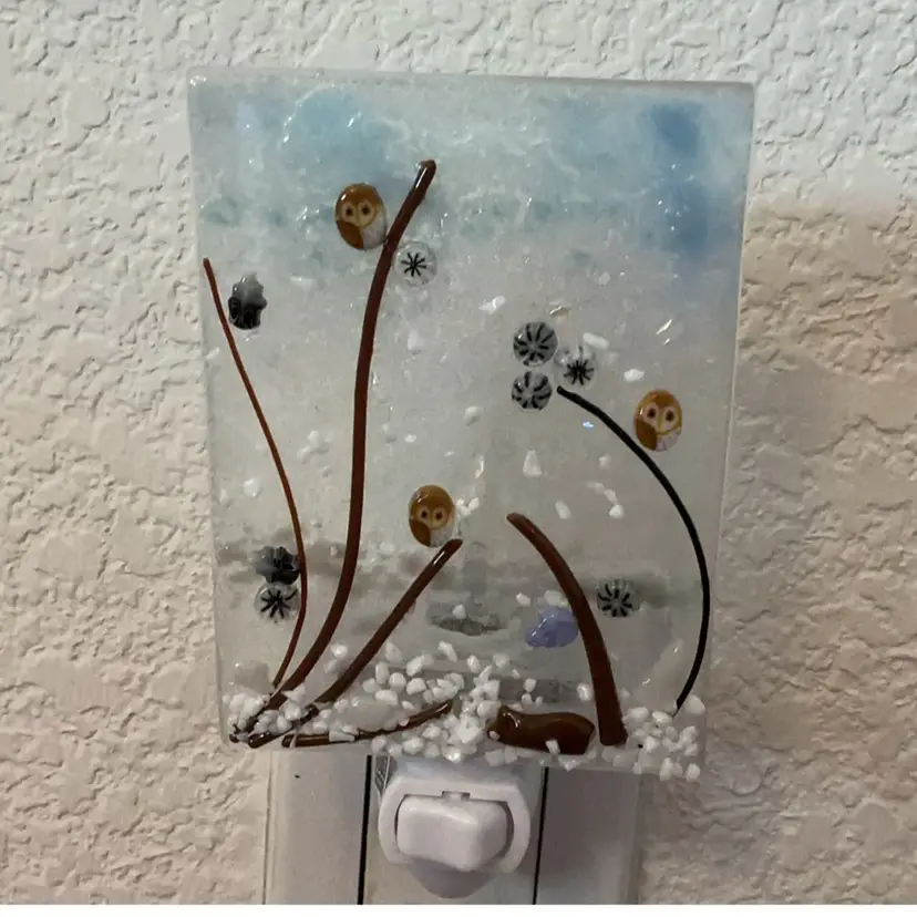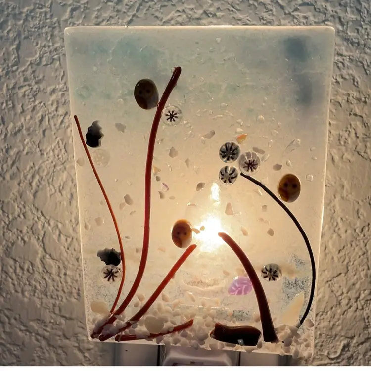 Nightlight, kiln made with love by me! Unique and varies in color placement, bubbles and depth of field. Shiny on the front, textured on the back, glass approximately 4” x 3-inches: with light 5.5". Made with Bullseye glass and elements from a variety of other glass artists. Nightlight hardware is new; manual on/off switch.