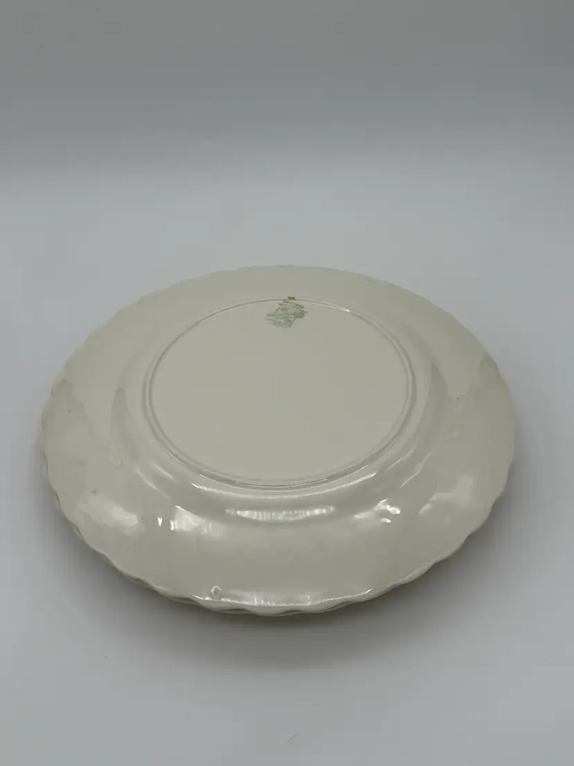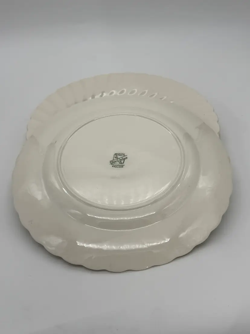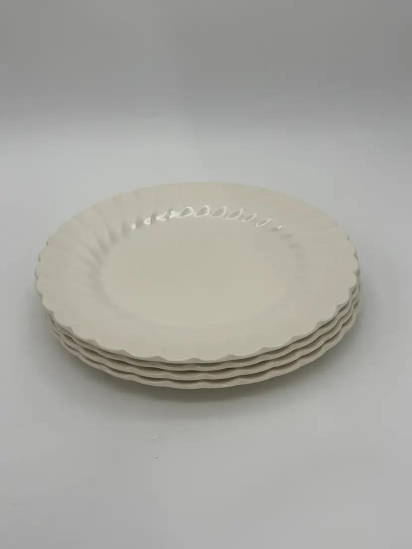 The Myott Staffordshire England Old Chelsea White Swirl Dinner Plates are a set of four 10-inch round earthenware plates originating from England in the mid-20th century. These vintage dinner plates feature a glossy finish and a decorative swirl pattern, making them suitable for all occasions. Hand wash only to preserve the original mid-century modern style of the plates, which are stackable for easy storage. Made with a crackle pattern and solid off-white color, these plates are a timeless addition to any dining table. The Myott brand ensures quality and origin from the United Kingdom. In very good pre-owned condition for their age very little crazing, some back stamps may be more faded than others due to their age over the years.