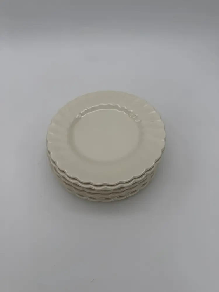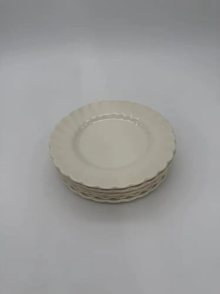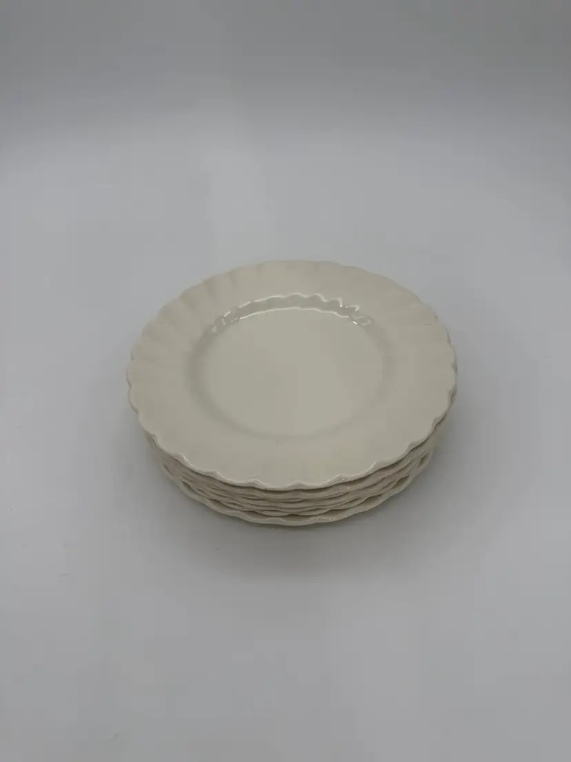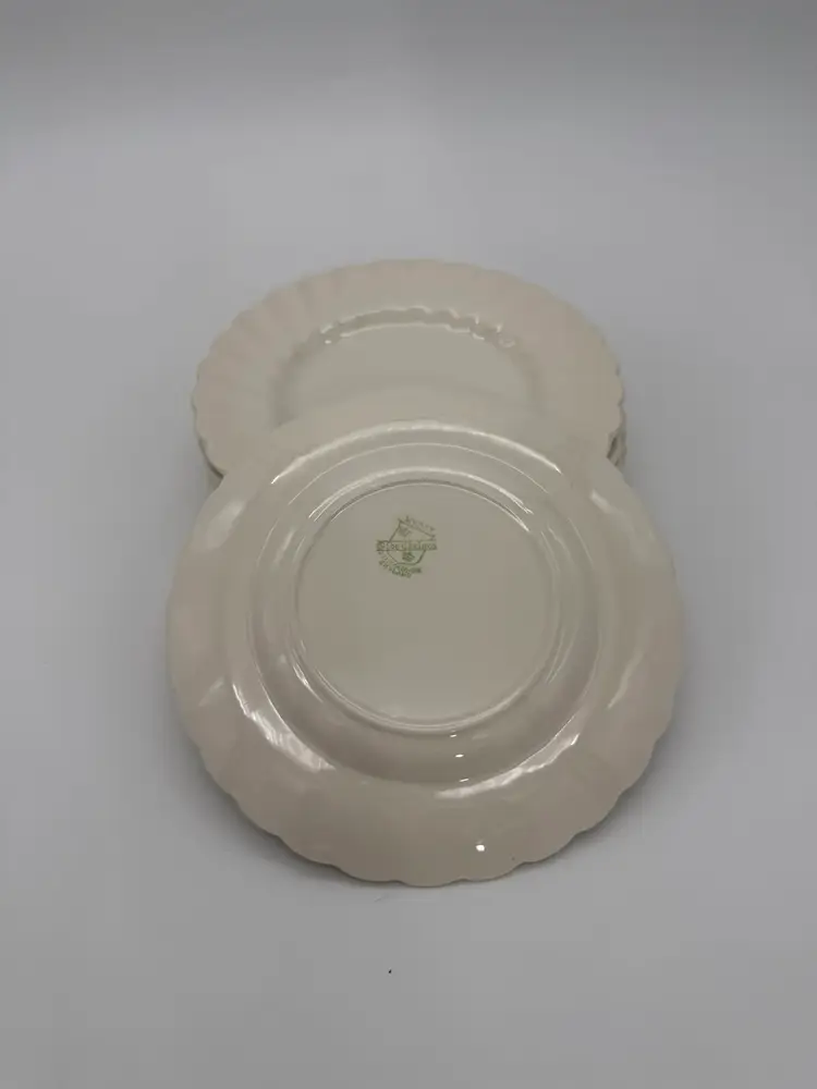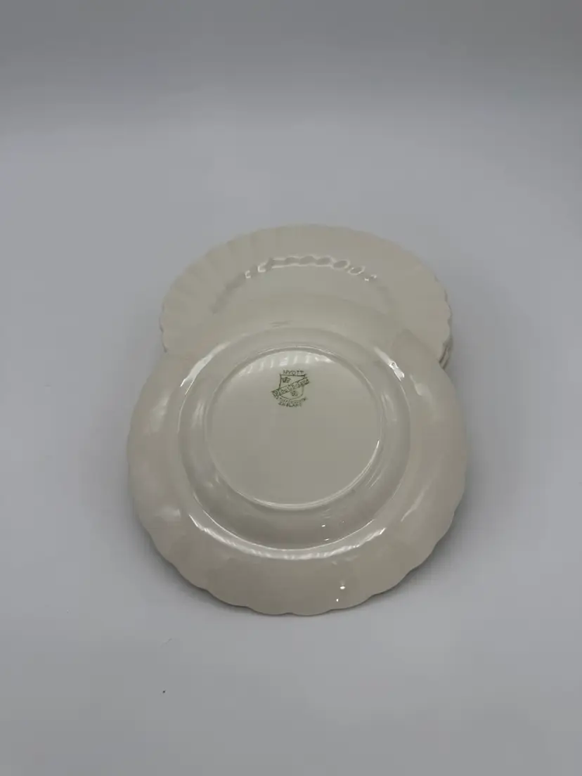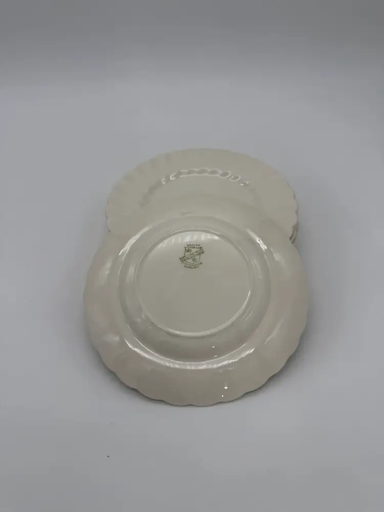 The Myott Staffordshire England Olde Chelsea White Swirl Saucers are a set of eight vintage pieces originating from England. These 6” saucers are round in shape, featuring a mid-century modern style with a glossy finish and a swirl pattern in an off-white color. Made of earthenware/ironstone, these decorative and stackable saucers are perfect for all occasions and are a charming addition to any table setting. With a printed backstamp and a production technique of pottery, these saucers showcase the craftsmanship and design of the 1960s. In very good vintage pre-owned condition for their age, no chips or cracks, with very little crazing. The back stamps may be a little more faded than others due to their age over the years.