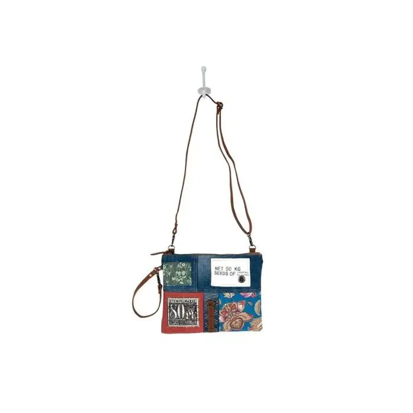 This unique crossbody bag features a charming patchwork design with various patterns and textures. Perfect for adding a touch of eclectic style to your outfit. Materials Canvas & Leather Item Width 11 Item Height 9 Handle 5 Shoulder 22 Color n/a