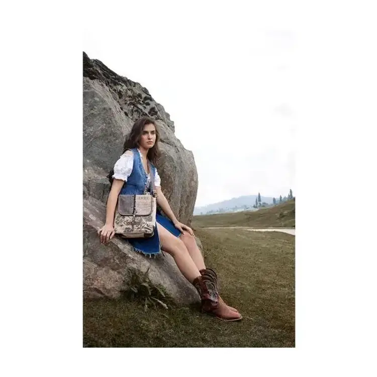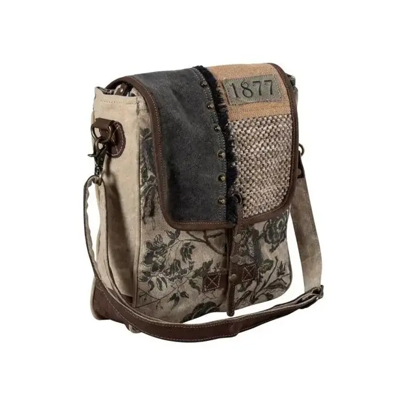 This crossbody bag features a charming vintage floral design with a unique '1877' patch. Perfect for adding a touch of rustic elegance to your outfit. Materials Canvas & Leather Item Width 11 Item Depth 3.5 Item Height 13 Shoulder 25 Color n/a Handle n/a