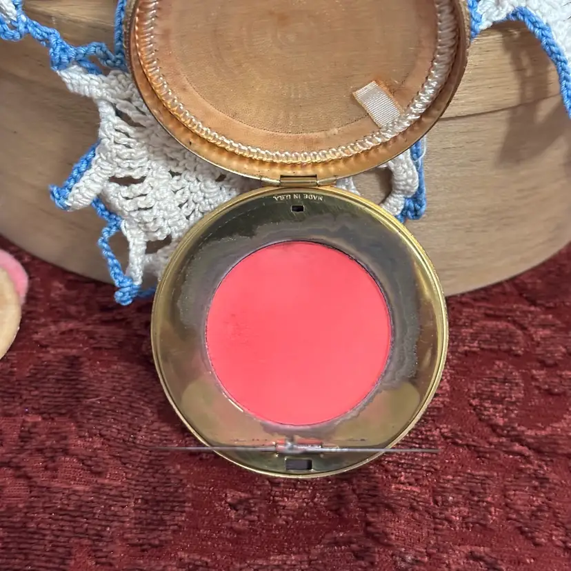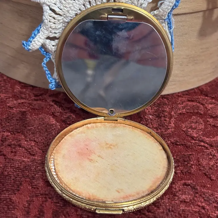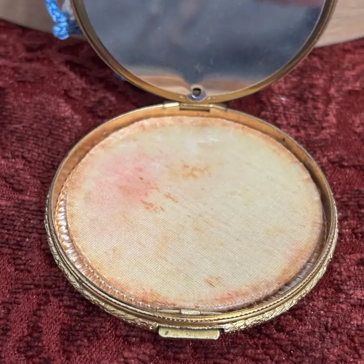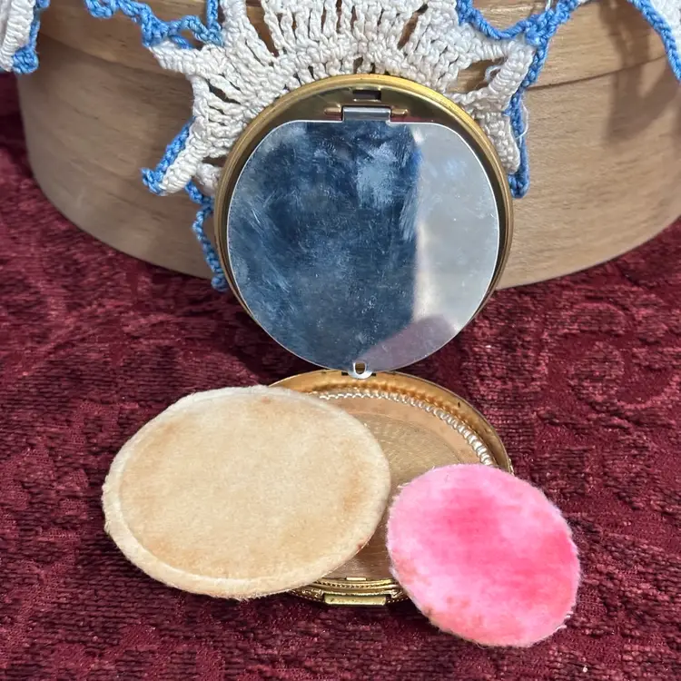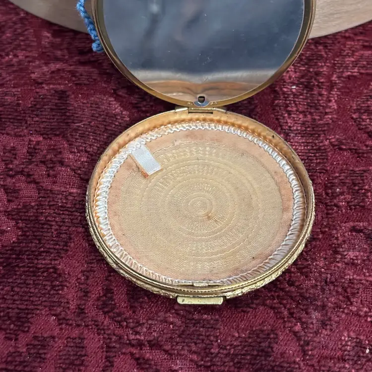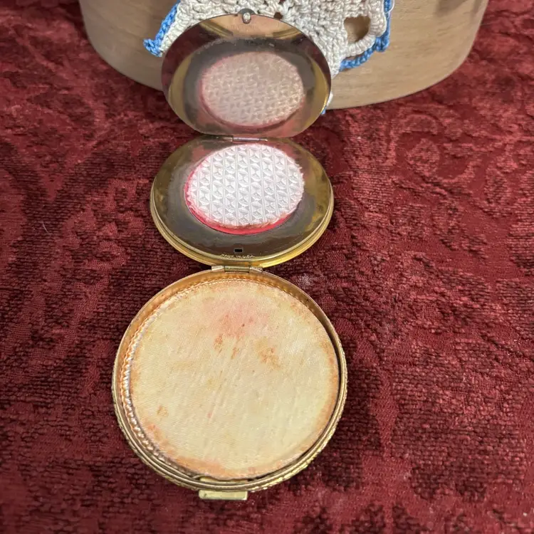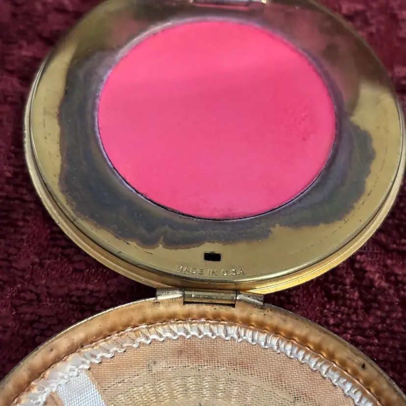 Absolute beauty. Still has powder puff and original rouge with applier. Shuts perfectly. A little discoloration to metal on rouge side.