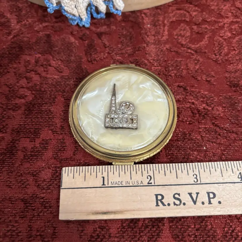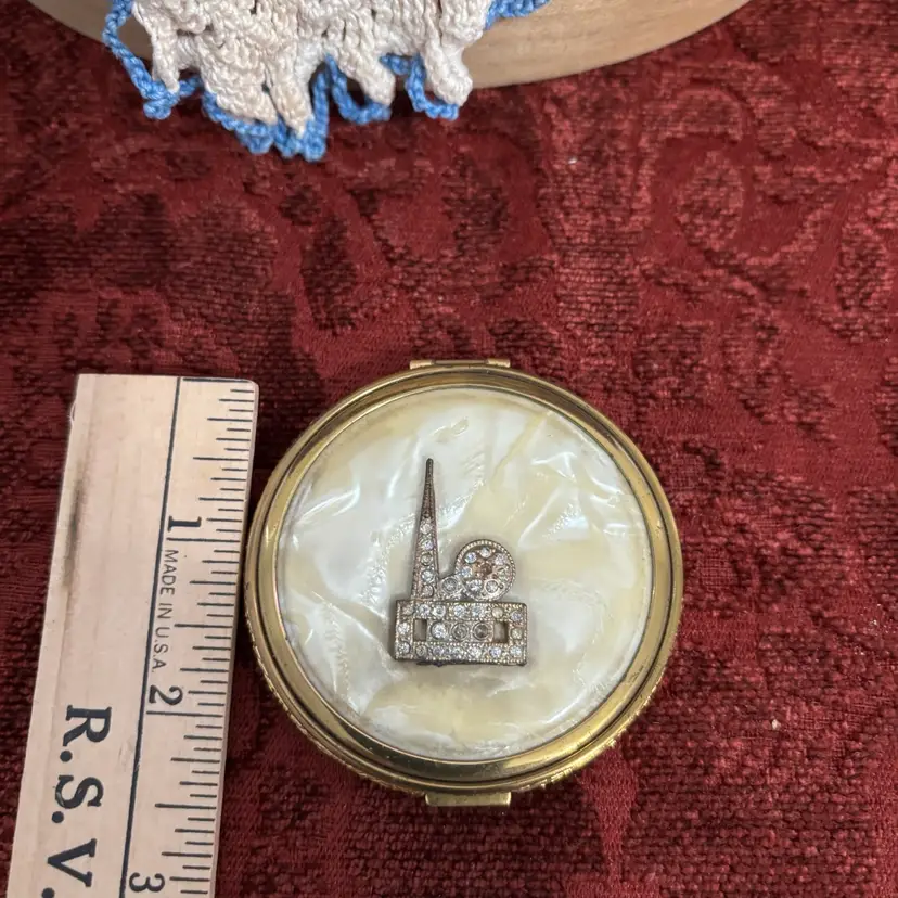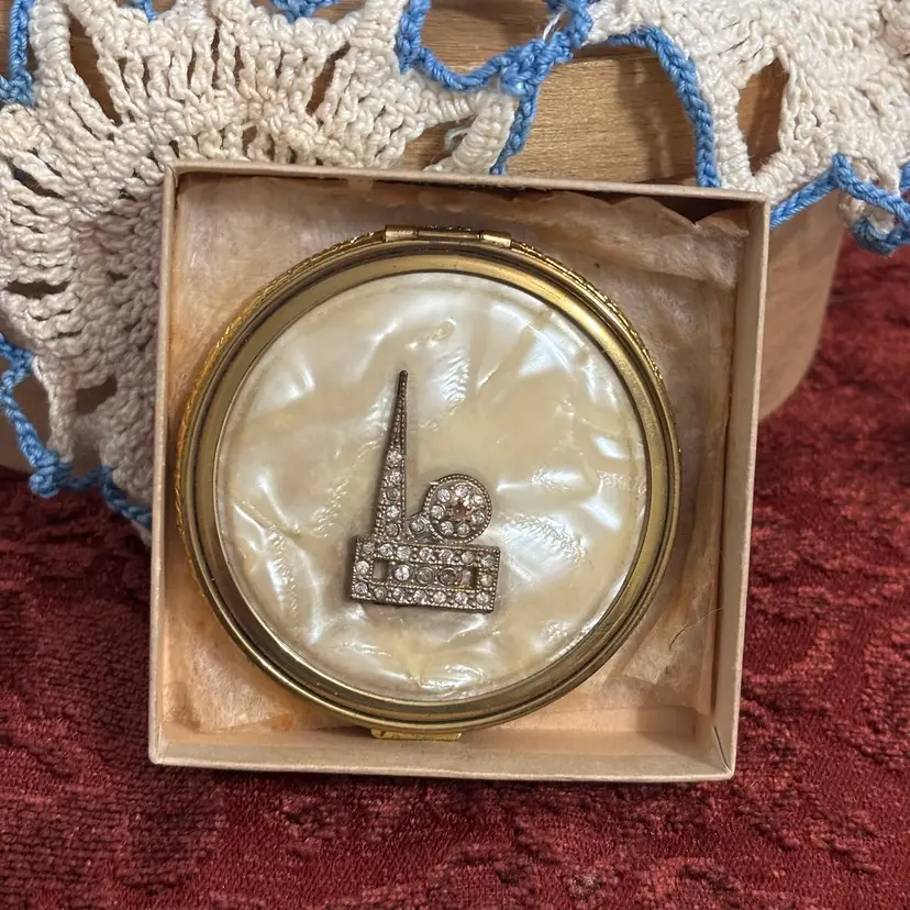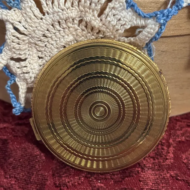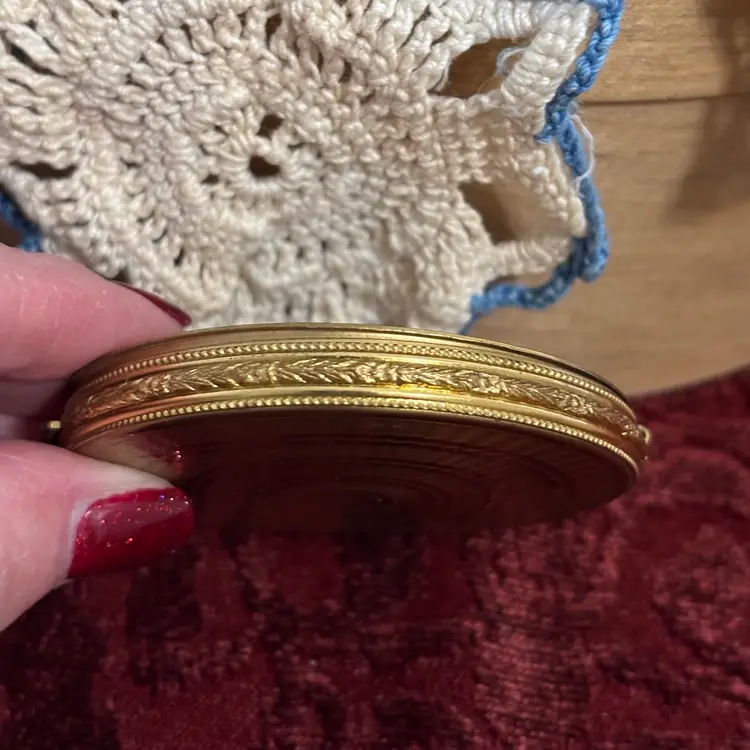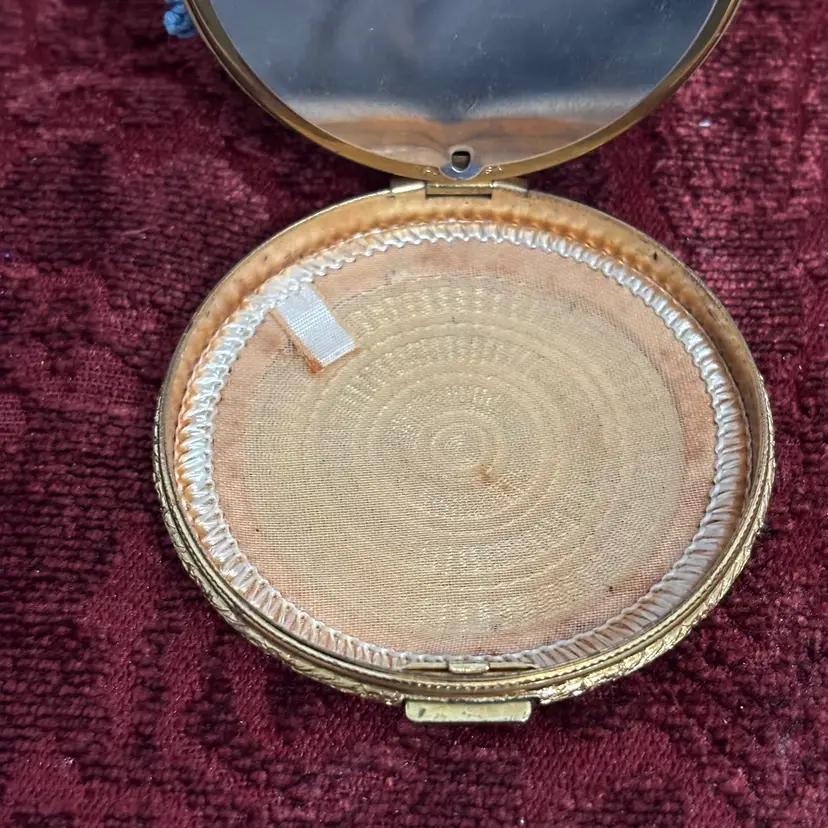 Absolute beauty. Still has powder puff and original rouge with applier. Shuts perfectly. A little discoloration to metal on rouge side.
