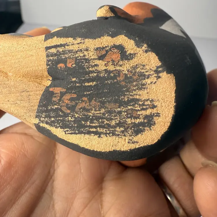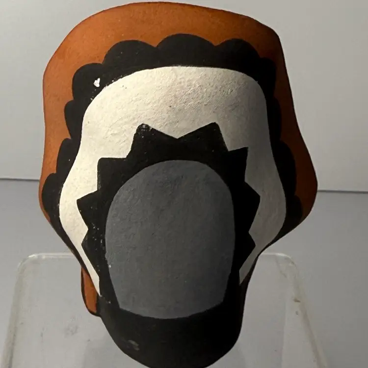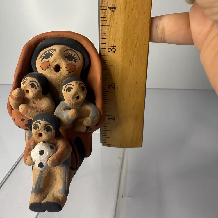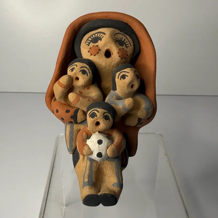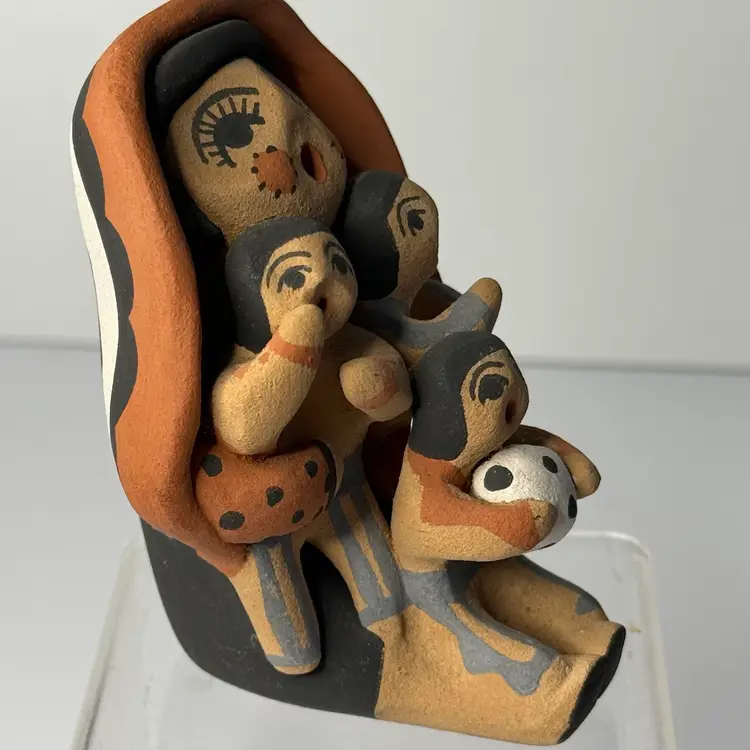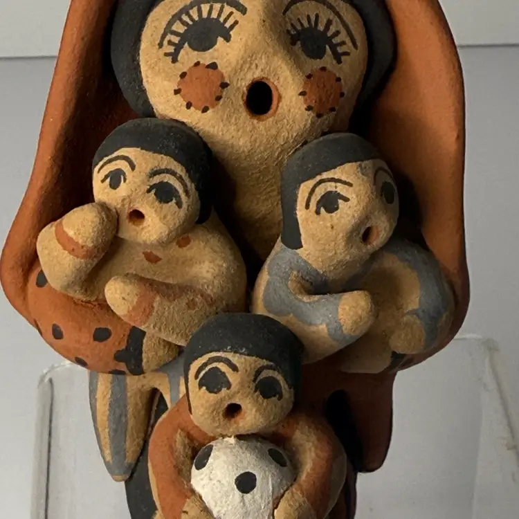This is a Jemez Pueblo storyteller figurine, a type of pottery that depicts a maternal figure, often a grandmother, with children clinging to her as she tells them stories. The storyteller figurine is a form of Native American pottery that originated in the Cochiti Pueblo in the 1960s with artist Helen Cordero. The tradition was adopted by other pueblos, including the Jemez Pueblo, which has become known for its storytellers. The figures are meant to symbolize the transmission of cultural heritage, knowledge, and wisdom from one generation to the next. The Fragua family is a prominent family of potters from the Jemez Pueblo known for creating storyteller figures.
