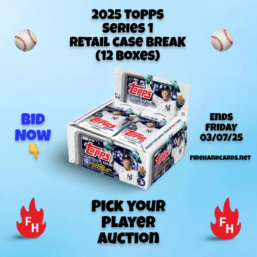 You are bidding on all the cards of the player listed in the title in this Retail Case (12x Boxes) of 2025 Topps Series 1 Baseball Cards. Auctions end Friday 03/7/2025; Case will be opened LIVE during the day on Saturday 03/8/2025. Opening will be viewable & simulcast on FirehandCards.net as well as the Firehand YouTube page. US Shipping is $5.00 for your first auction spot won; and only $.25 for each spot after that! Any spot won where no cards of the player are found in the box will receive a bonus card from Firehand Cards. Any hit pulled (Cut Autos, Sketches, Hidden Gems etc) of a player who is NOT listed in the auction will be assigned by draw between all participants. Any dual or multi-player #'d or auto cards featuring multiple players will be assigned live between the spots depicted on the card. *Note - Base Checklist "League Leader" cards will be assigned as fairly as possible between the players depicted on each card.