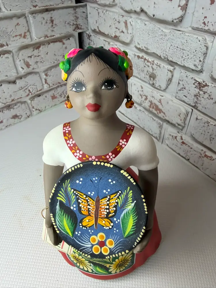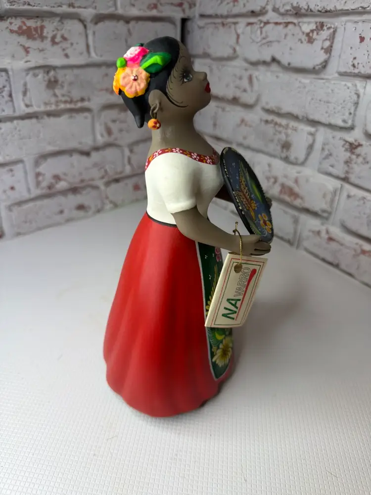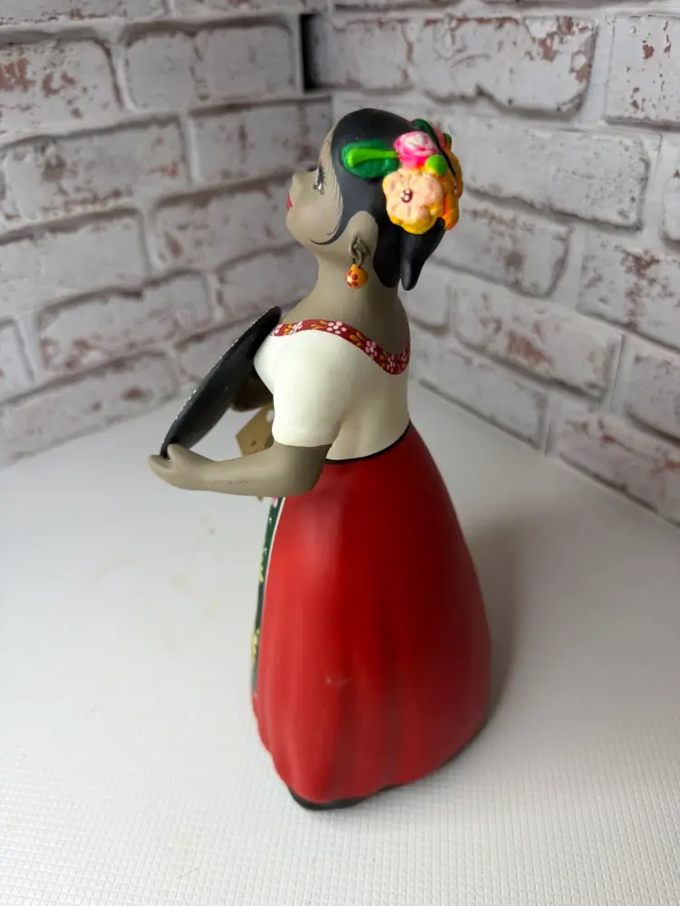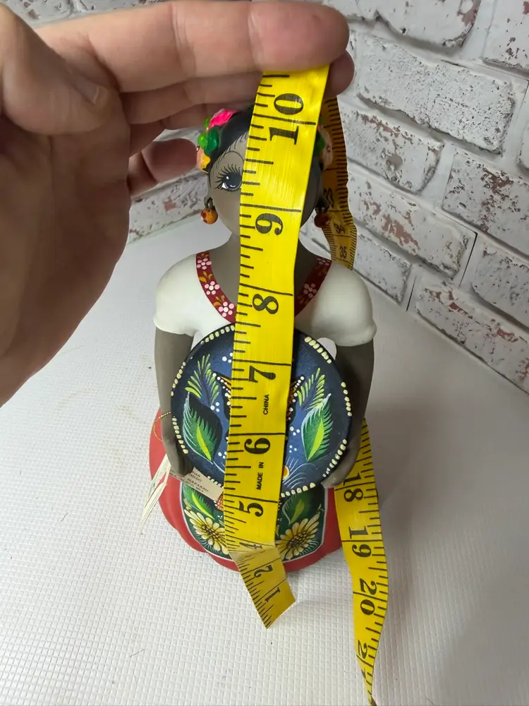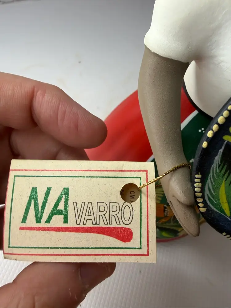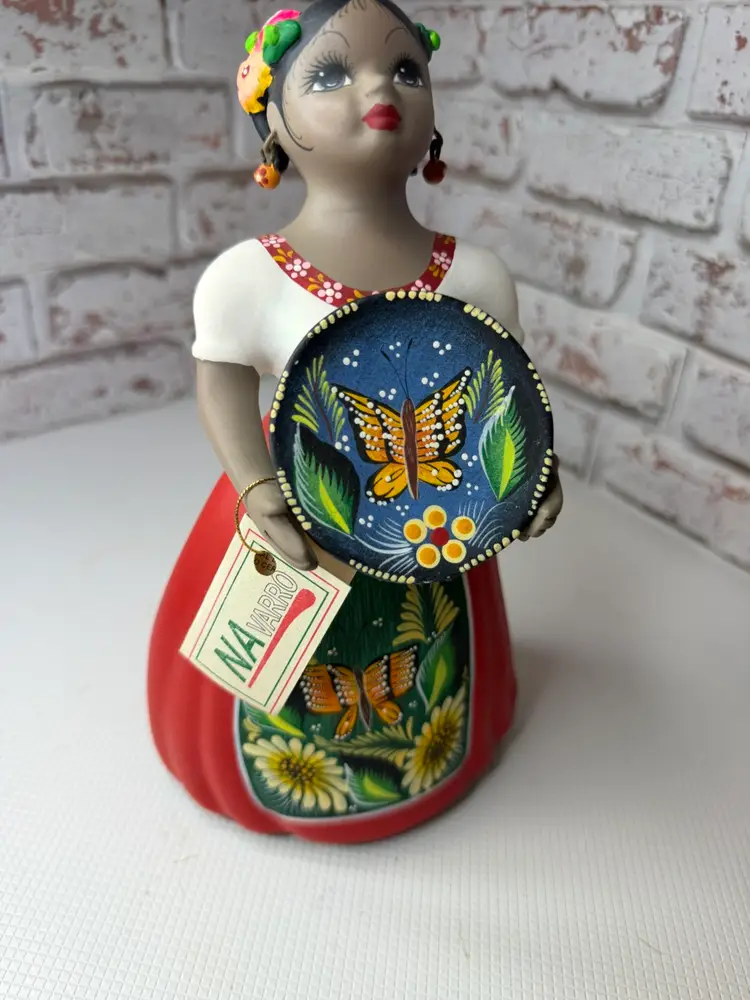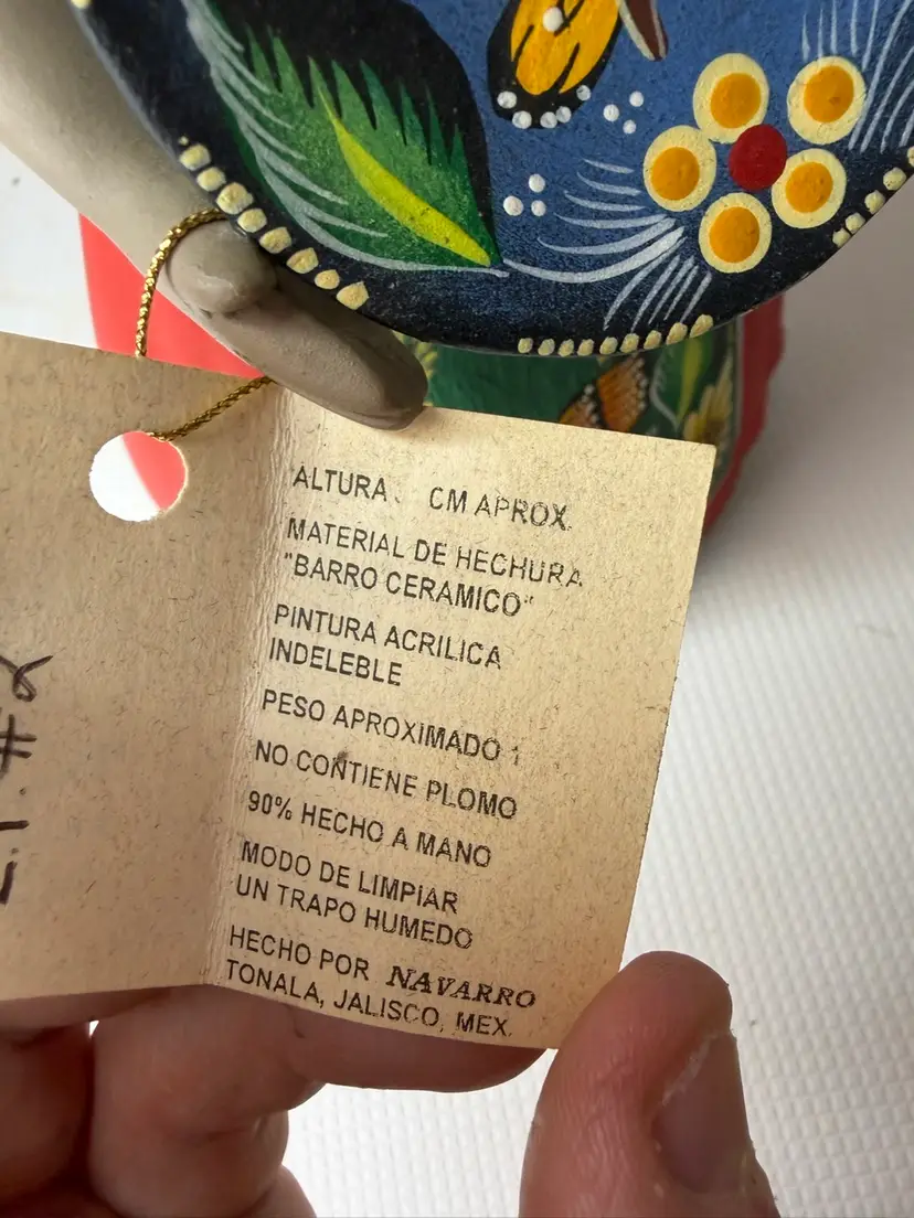 by various artisans in Mexico, with some of the more well-known workshops being Najaco and Navarro, which are often found in Tonalá, Jalisco. The figurines are known for their vibrant colors and detailed designs. Each doll is unique due to being individually handcrafted and painted, with slight variations in color and design.