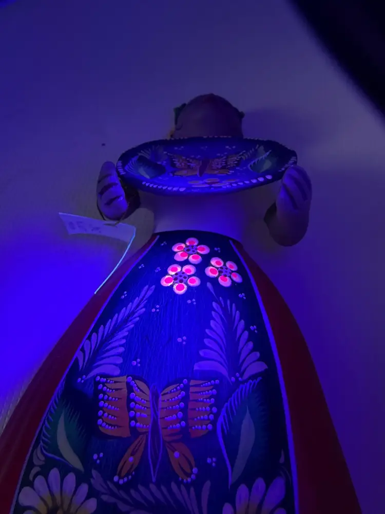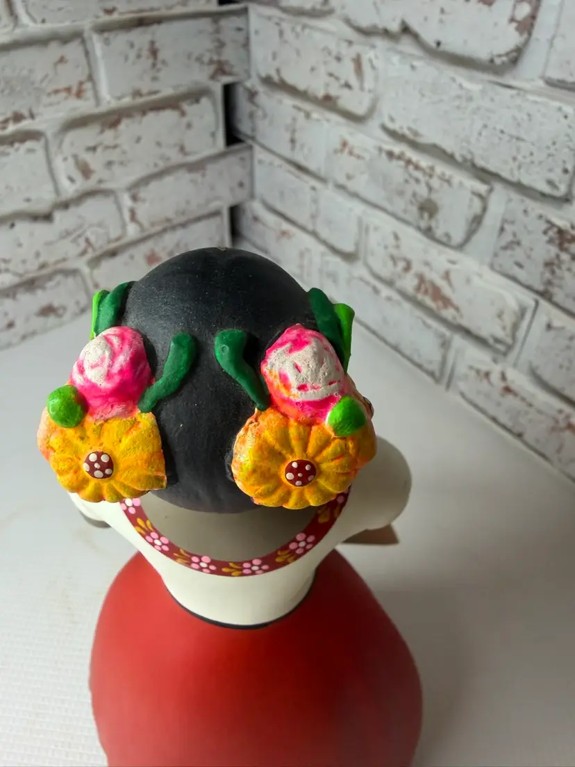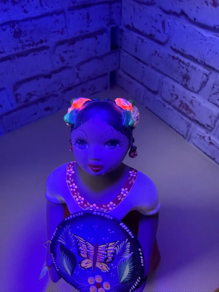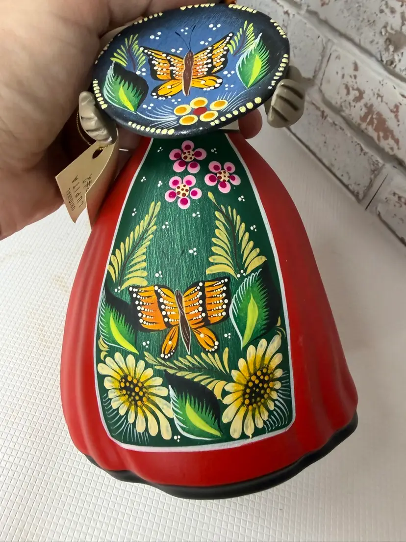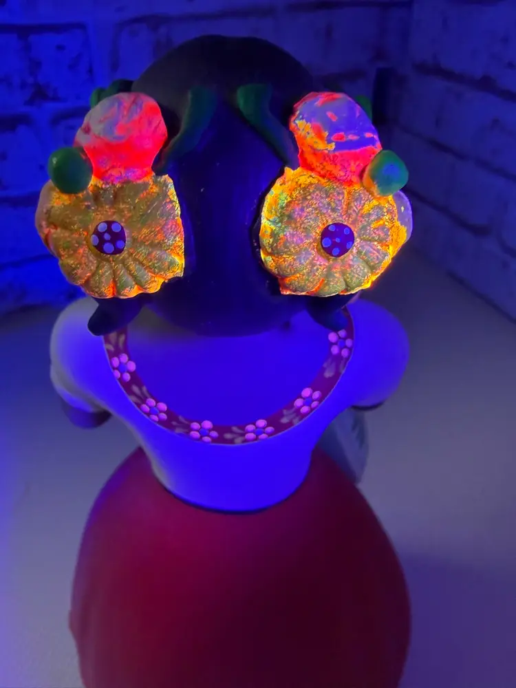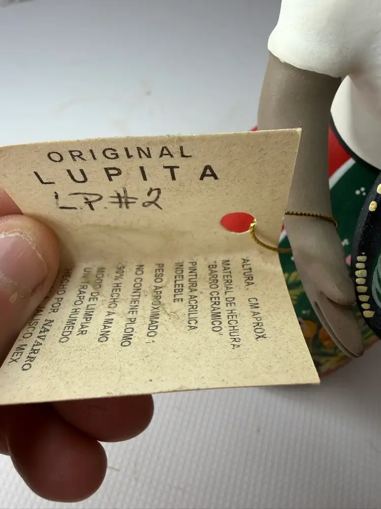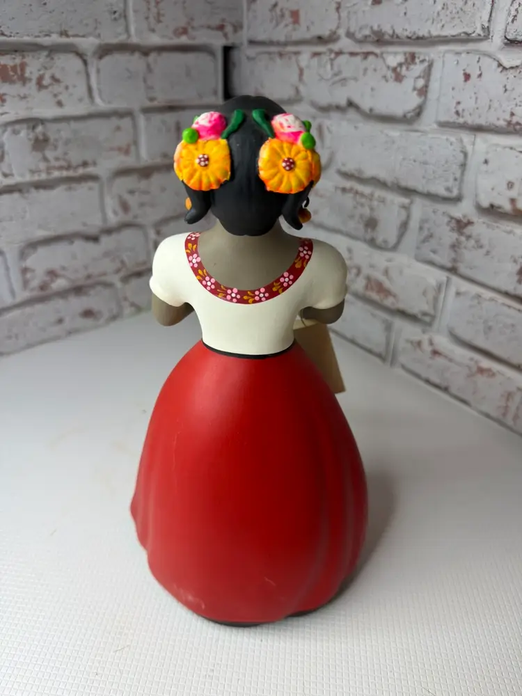 by various artisans in Mexico, with some of the more well-known workshops being Najaco and Navarro, which are often found in Tonalá, Jalisco. The figurines are known for their vibrant colors and detailed designs. Each doll is unique due to being individually handcrafted and painted, with slight variations in color and design.