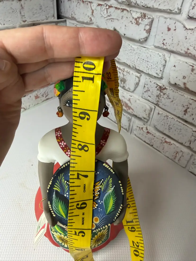 Measures 10.3” tall and it does have some scratches on it and paint loss on her head