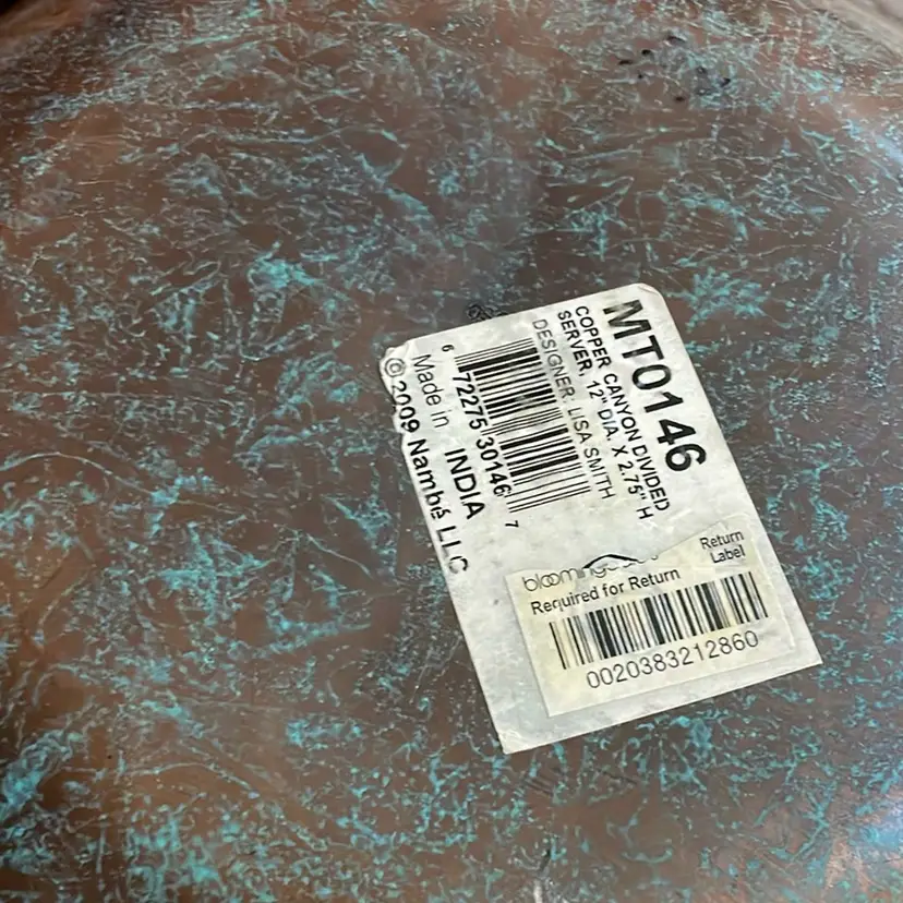 The object in the image is a Nambé Copper Canyon Divided Server, designed by Lisa Smith. It is made from Nambé Alloy with a copper coating and a clear protective finish. The design, inspired by the wind- and water-worn canyons of the American Southwest, features a rustic green patina on the exterior. It is food safe and can be placed in the freezer to chill. The server is approximately 12 inches in diameter.