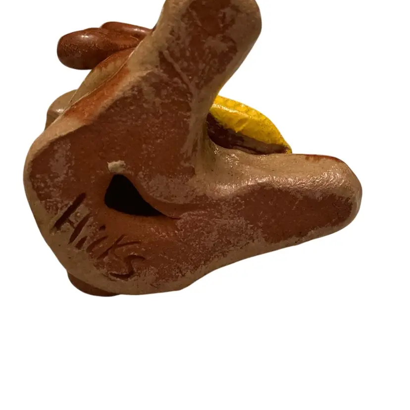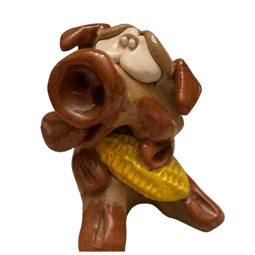 2 1/2” x 2 1/2” pottery pig holding corn signed Hicks