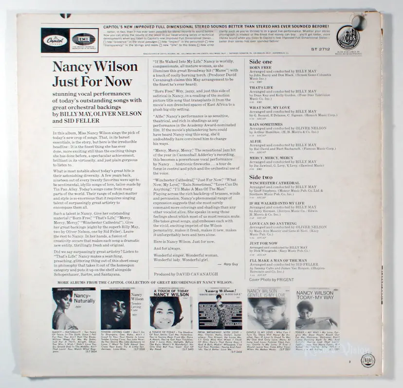 Just For Now, by Nancy Wilson, released by Capitol Records during the height of her commercial success in the 1960s. The album showcases Wilson's signature blend of jazz, pop, and R&B influences across 11 tracks, highlighting her velvety voice and interpretive prowess on standards and contemporary tunes. Historically significant as part of Wilson's prolific output that year—coinciding with her Emmy-winning NBC series The Nancy Wilson Show—it exemplifies the era's crossover appeal for Black artists amid the Civil Rights Movement, where Wilson was an active advocate. Commercially, Just For Now peaked at No. 40 on the Billboard 200 and reached No. 8 on the Top R&B Albums chart, underscoring her enduring popularity.