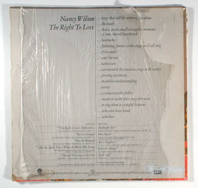 The Right to Love, by Nancy Wilson, is a repackaging of her 1967 album Lush Life with a different track order and omitting the song Sunny. Arranged by Billy May, Sid Feller, and Oliver Nelson, the album showcases Wilson’s sultry and soulful vocal style, with standout tracks like the title song praised for its orchestral arrangement and jazz standard interpretation. Critics, such as Nick Dedina from AllMusic, commend the album for its sophisticated mix of big band, small-group jazz, and moody orchestral elements, highlighting Wilson’s ability to bridge genres. The album remains a testament to Wilson’s interpretive artistry and her significant influence in jazz and pop music