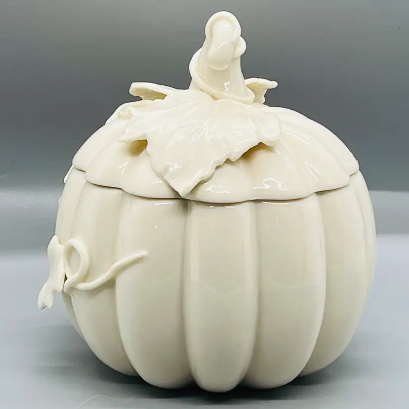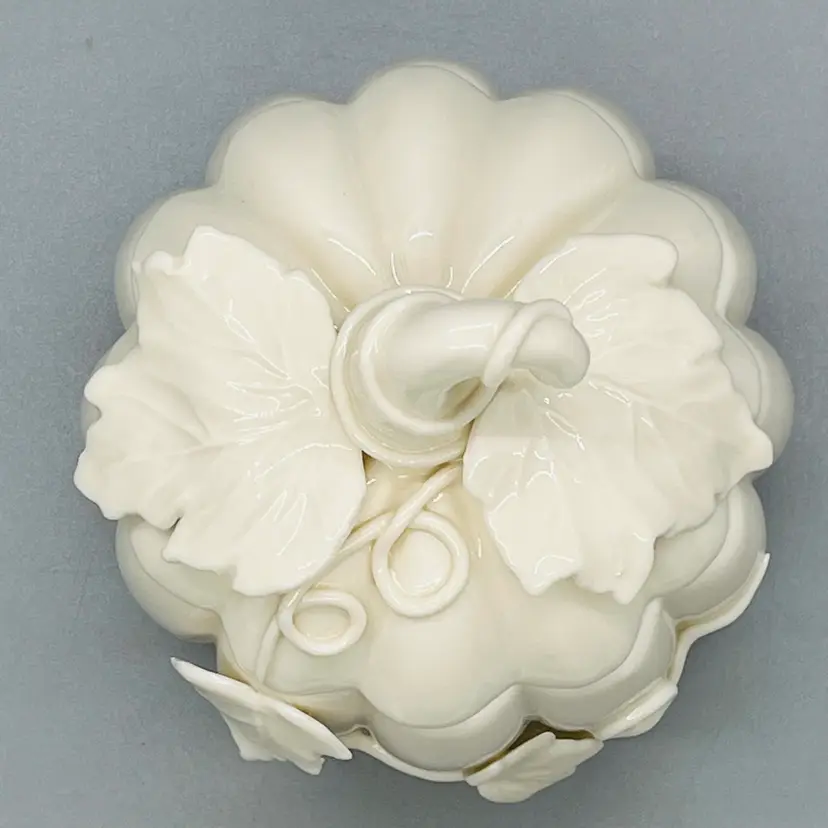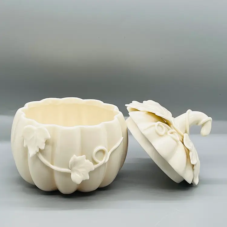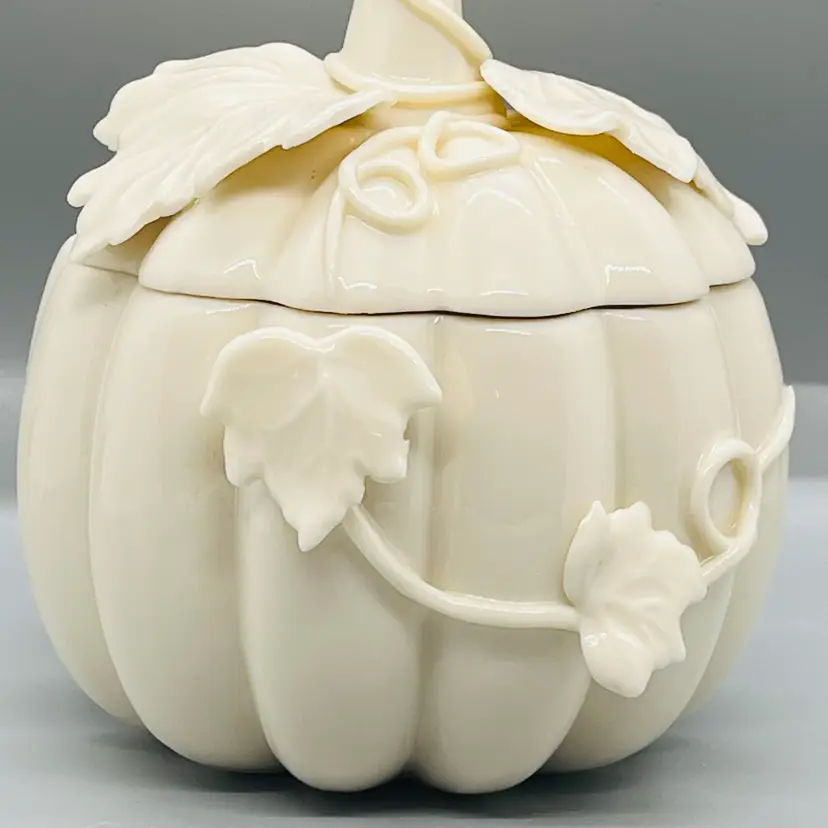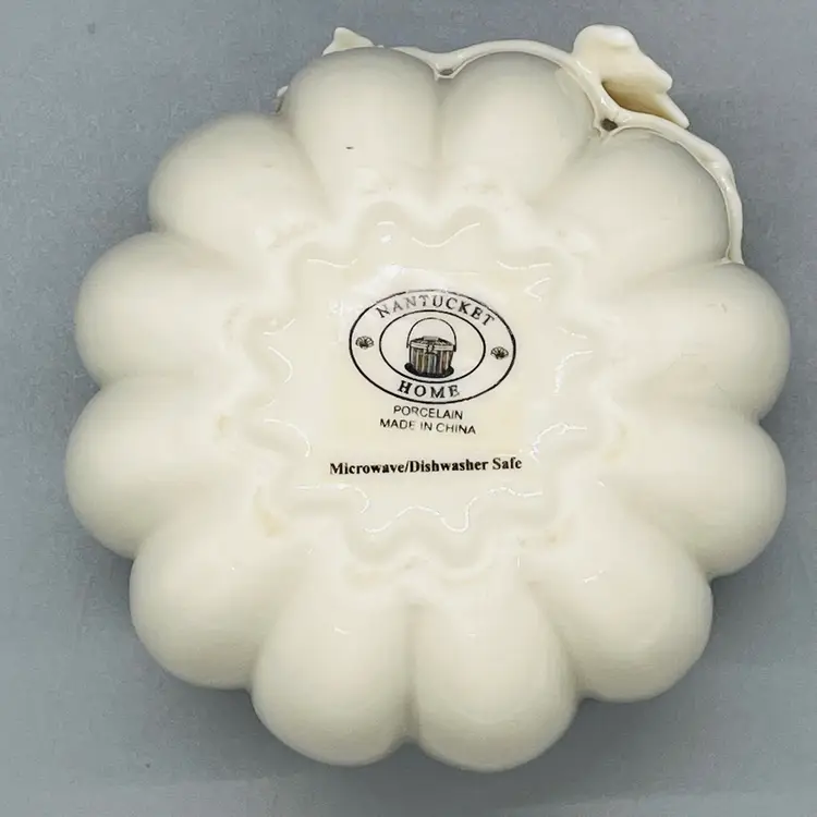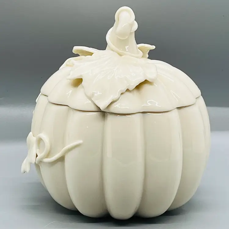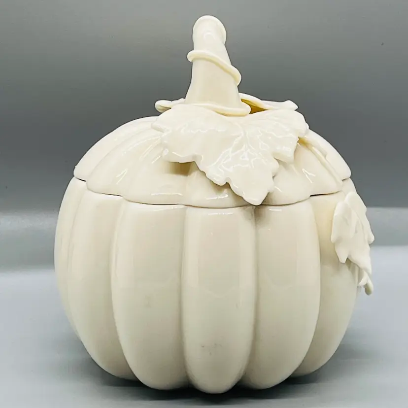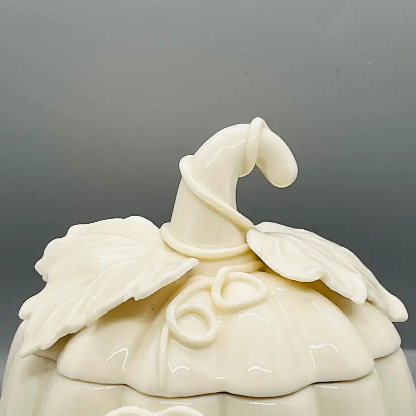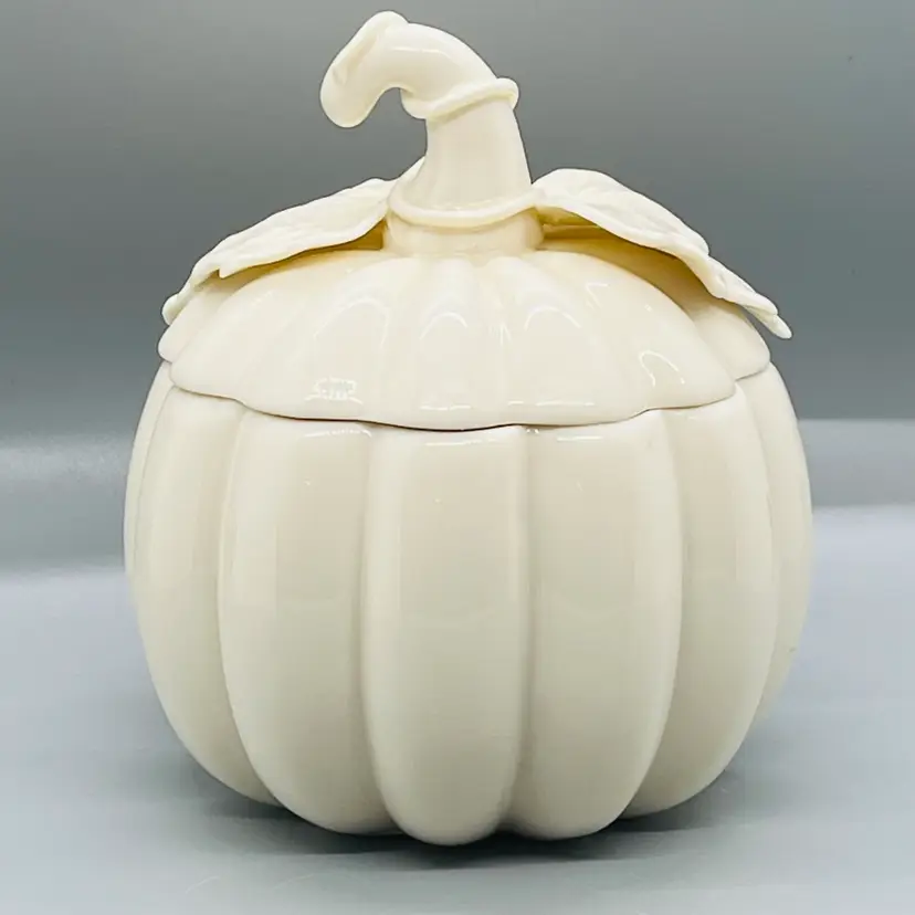 This is a Nantucket Home White Lidded Porcelain Pumpkin Candy Trinket Jar Fall Decor.