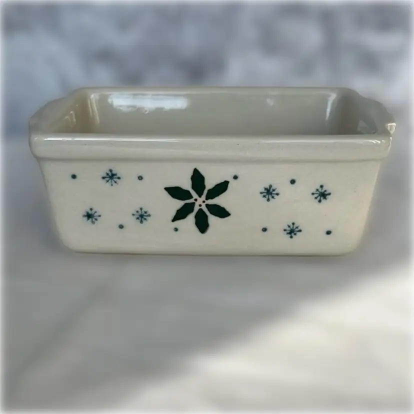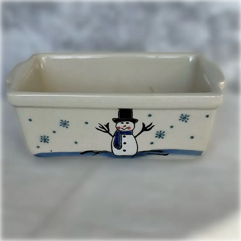 This mini loaf pan with snowman is perfect for gift giving your favorite bread or cake. See photos for condition issues on the inside of pan.