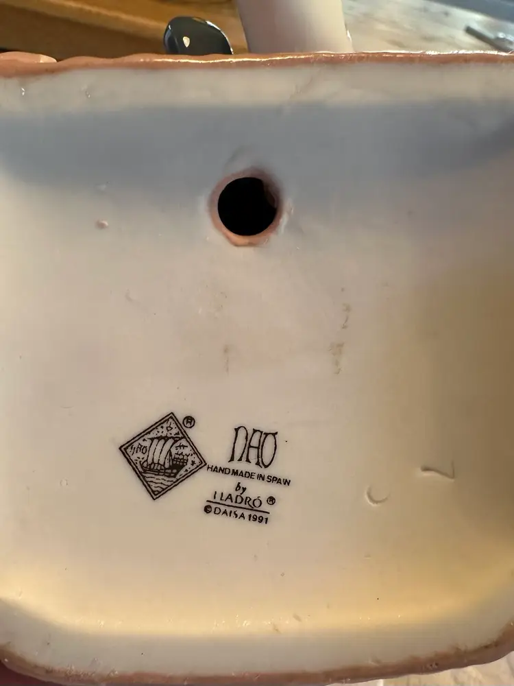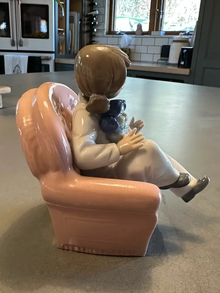 Nao by Lladro figurine of girl sitting in a pink chair with her doll. It is 6” tall. Excellent condition, no chips, cracks or repairs.