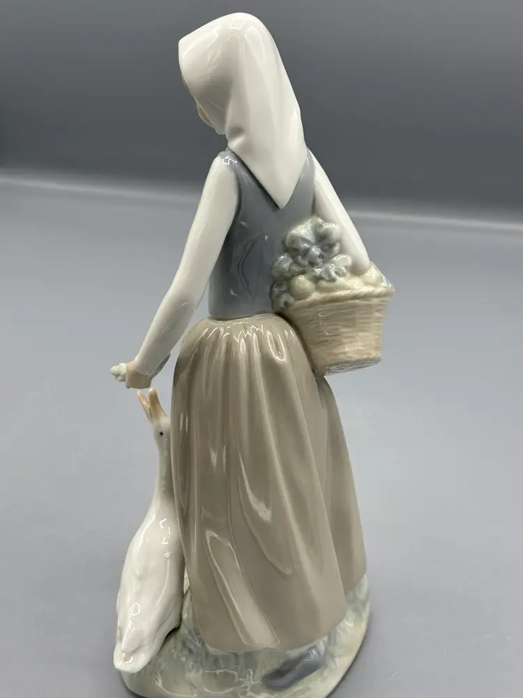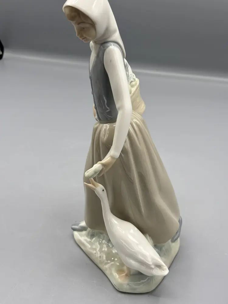 This charming Nao porcelain figurine captures a delightful moment between a young girl and her feathered companion, adorned with graceful floral accents. Standing at 9 1/2 inches tall with a 4 1/4 inch width, this piece exemplifies the refined craftsmanship Nao is renowned for. The intricate hand-painted details and fine porcelain construction make it an excellent addition to any decorative collection or a thoughtful gift for porcelain enthusiasts.