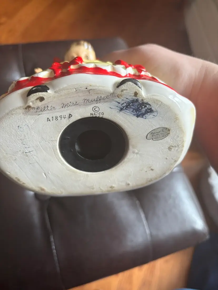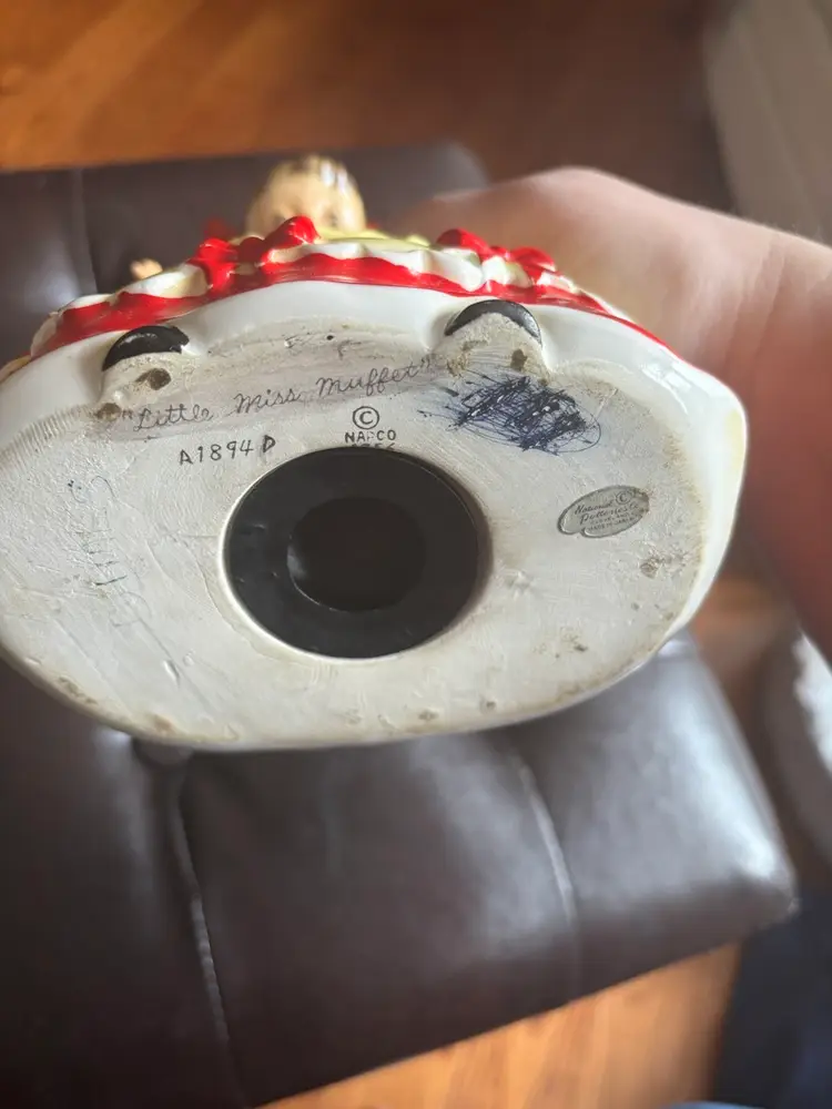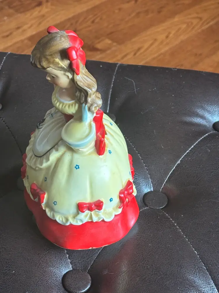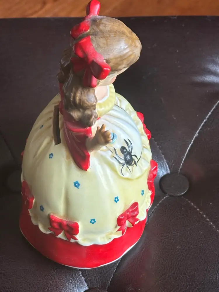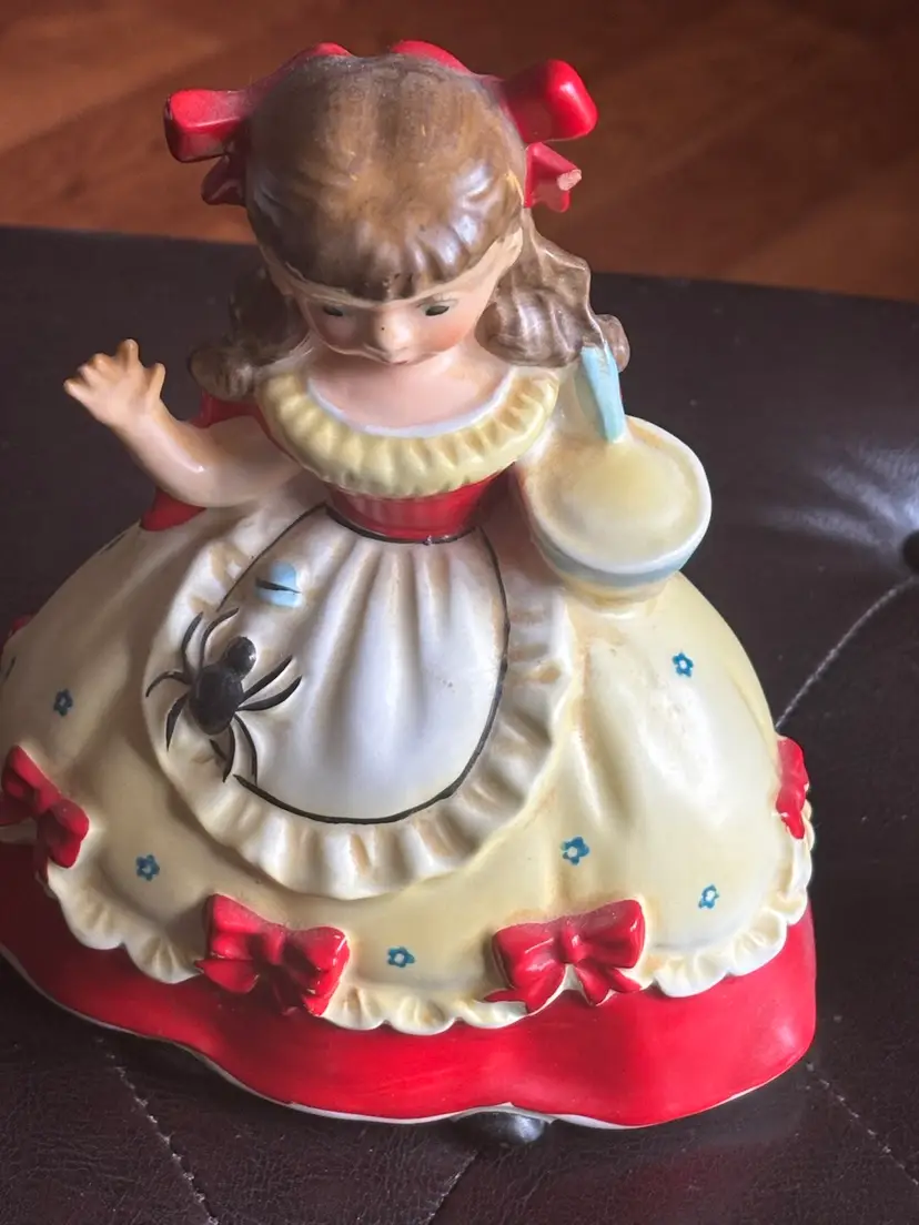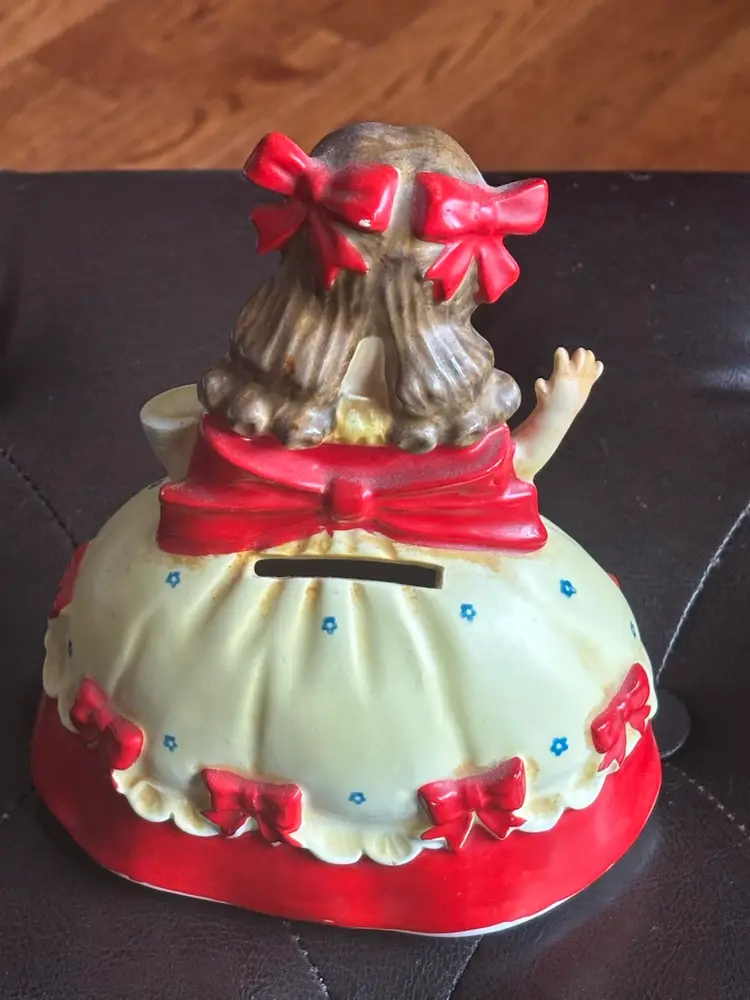 Charming ceramic girl figurine piggy bank with red accents. Features a cute apron design.