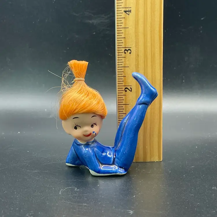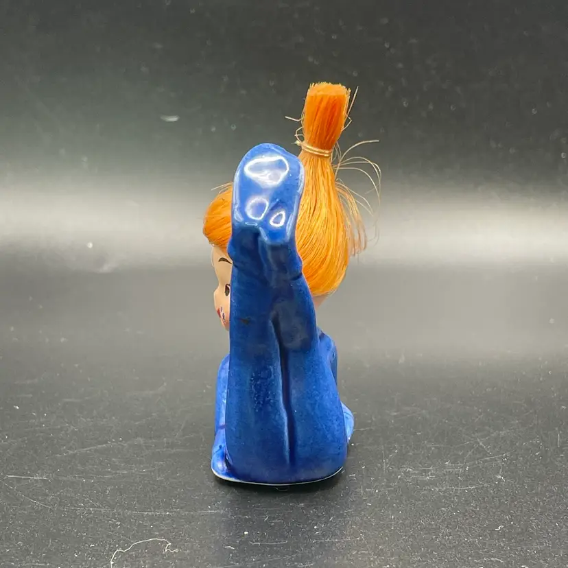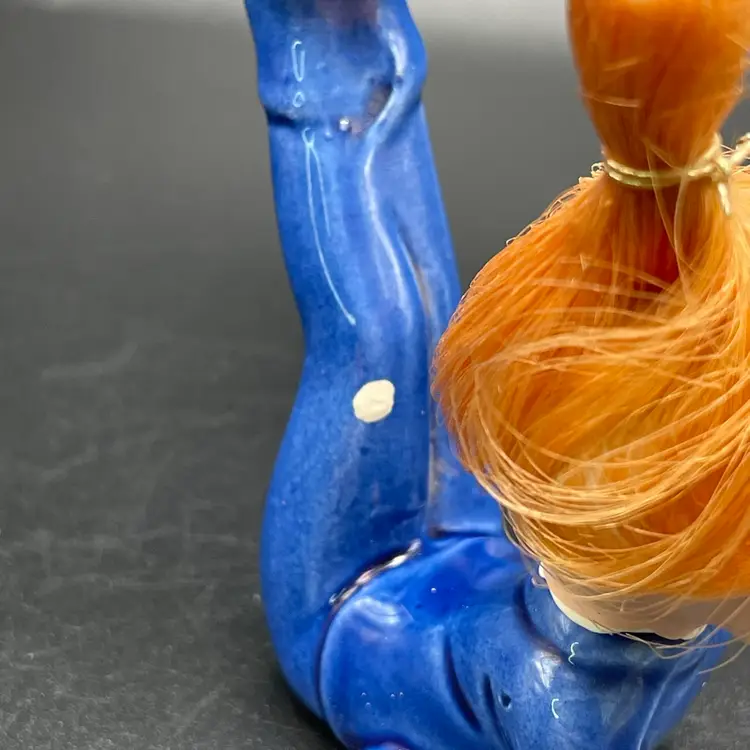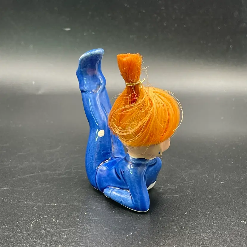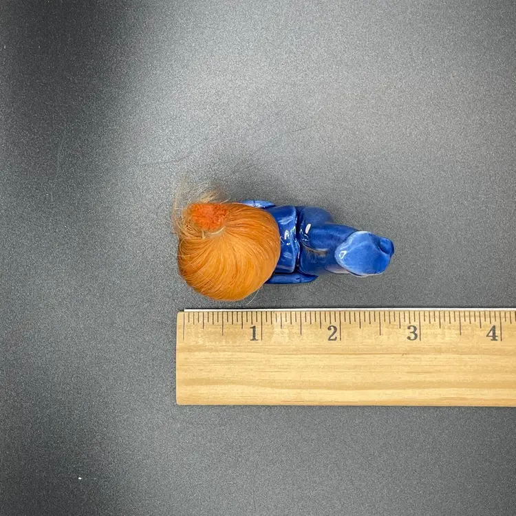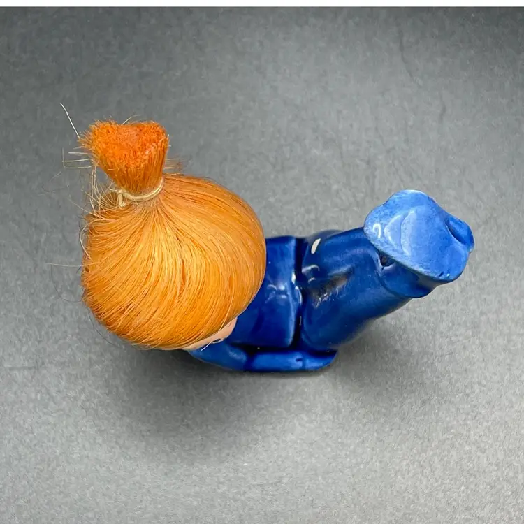 This is a vintage Napco blue pixie elf with orange hair miniature figurine. Measures approximately 2.75" tall x 3" long. There is blue paint on one cheek and a paint chip on the back leg near the knee. See photos for details. No other major flaws.