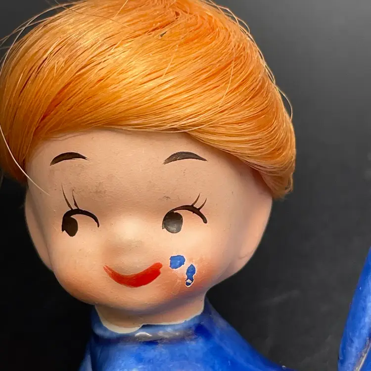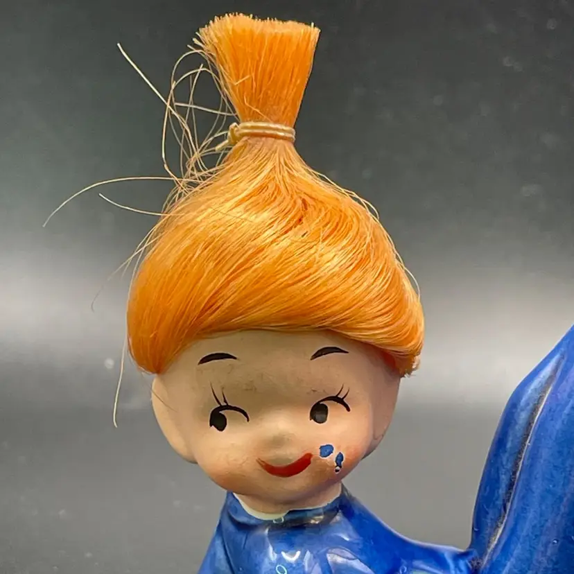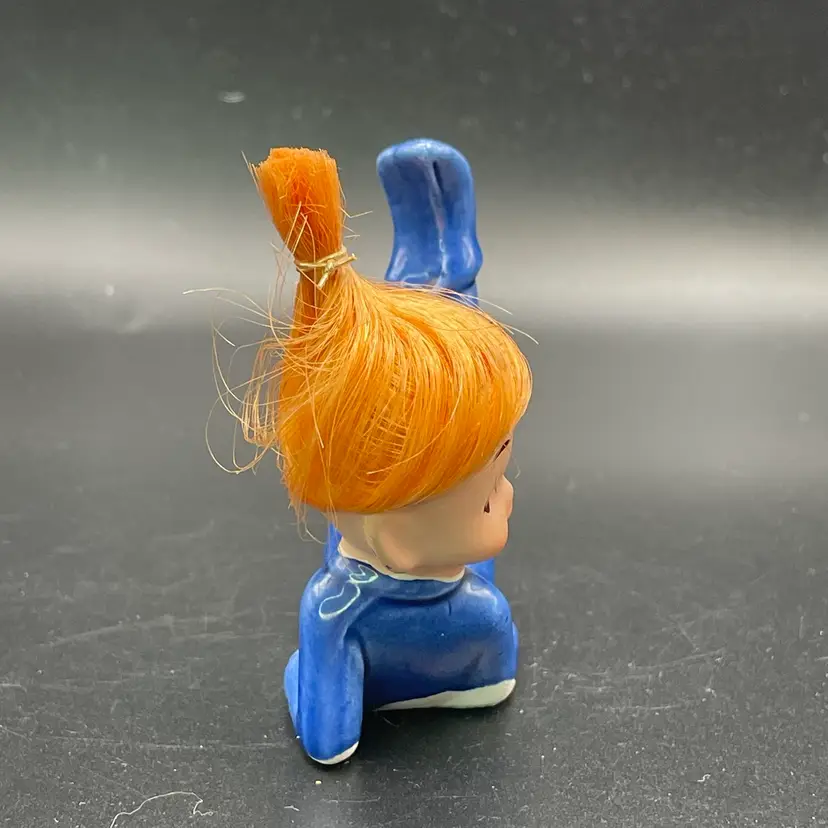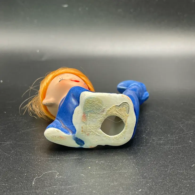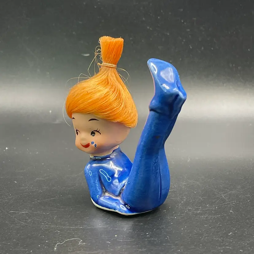 This is a vintage Napco blue pixie elf with orange hair miniature figurine. Measures approximately 2.75" tall x 3" long. There is blue paint on one cheek and a paint chip on the back leg near the knee. See photos for details. No other major flaws.