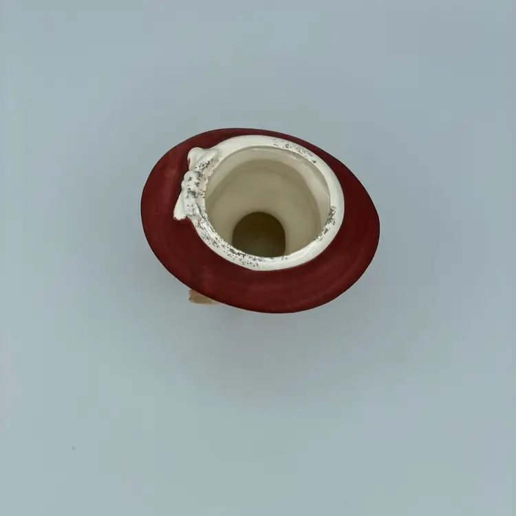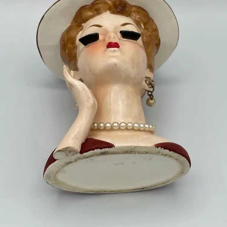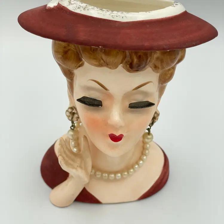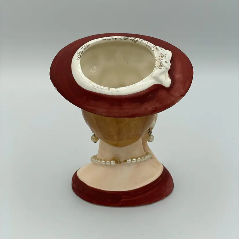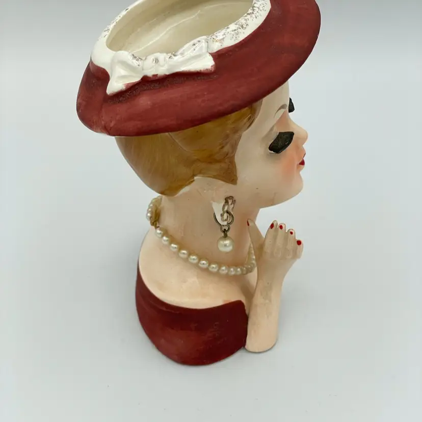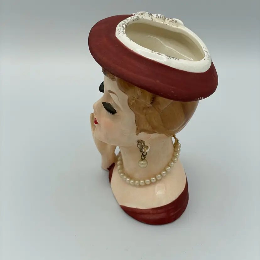 Napco Head Vase Planter. Dark Blonde With Reddish/Brown Dress and Hat With Bow. Pearl Necklace and Earrings. C3307 Ceramic Made In Japan - 1958 4 1/2" Tall X 3 3/4" W. Good Vintage Condition. *