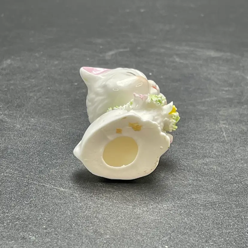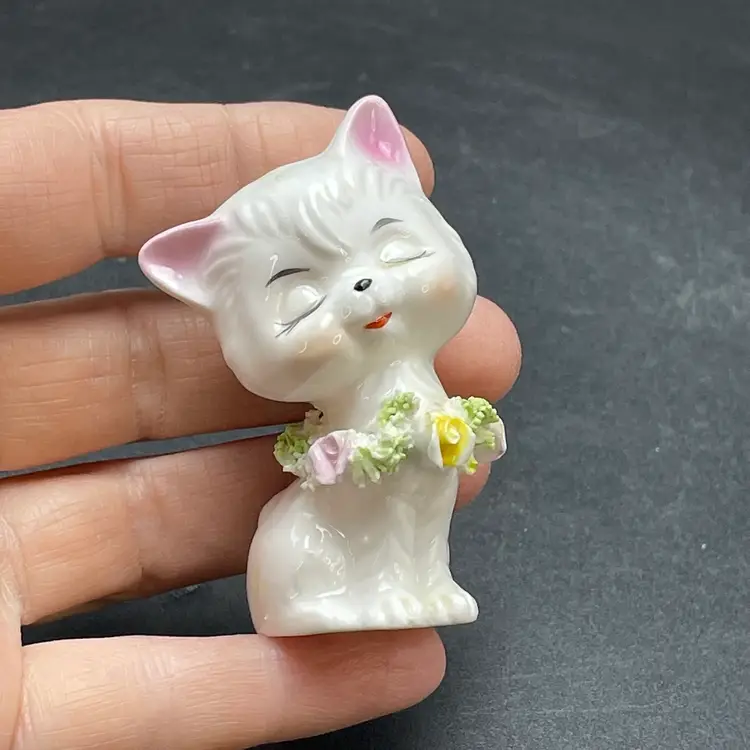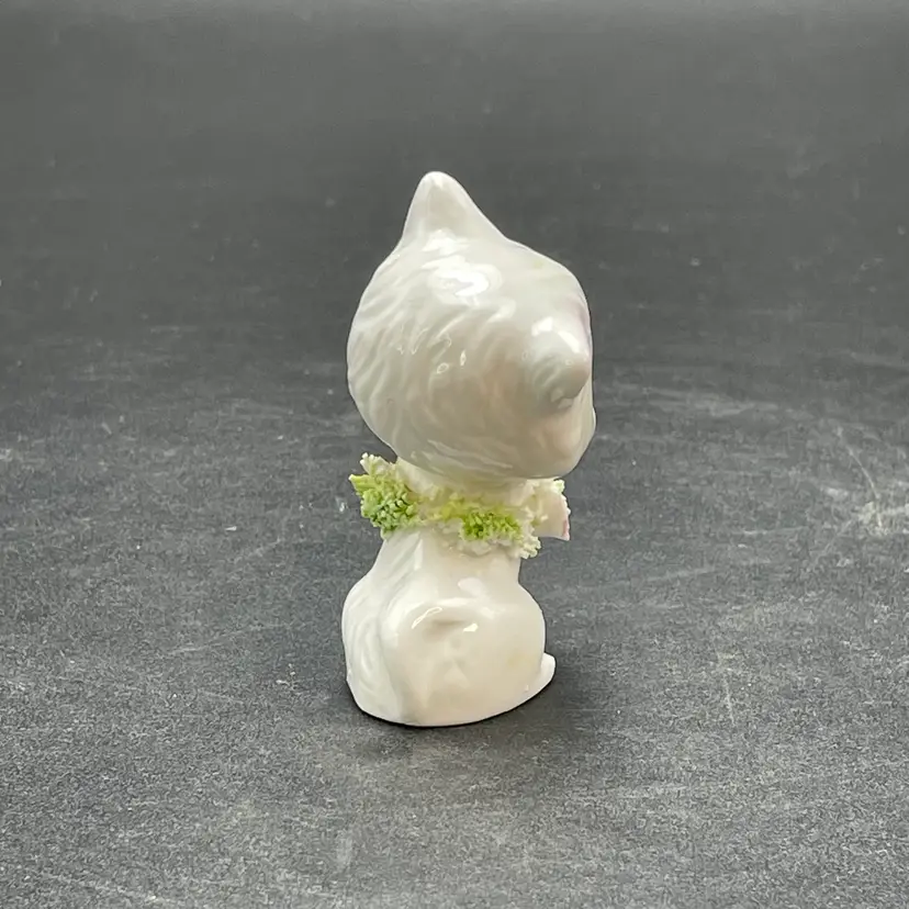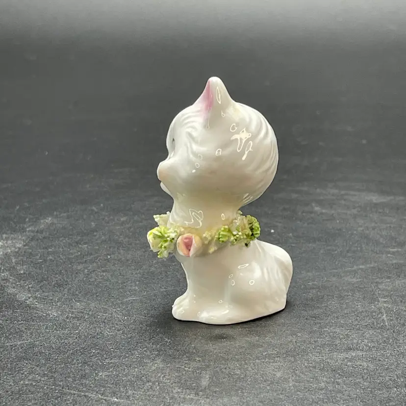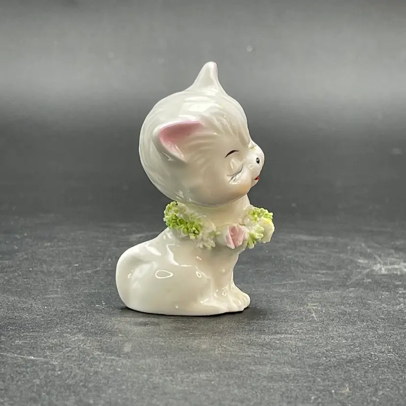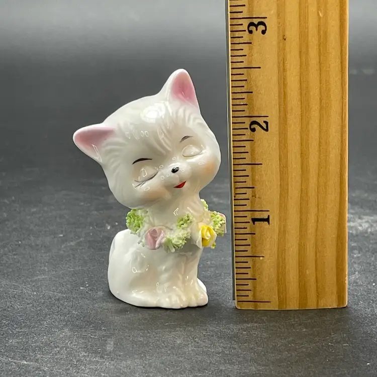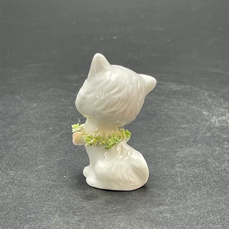 This is a vintage Napco miniature white bone china cat with spaghetti flowers figurine. Measures approximately 2.5" tall. No chips or cracks.