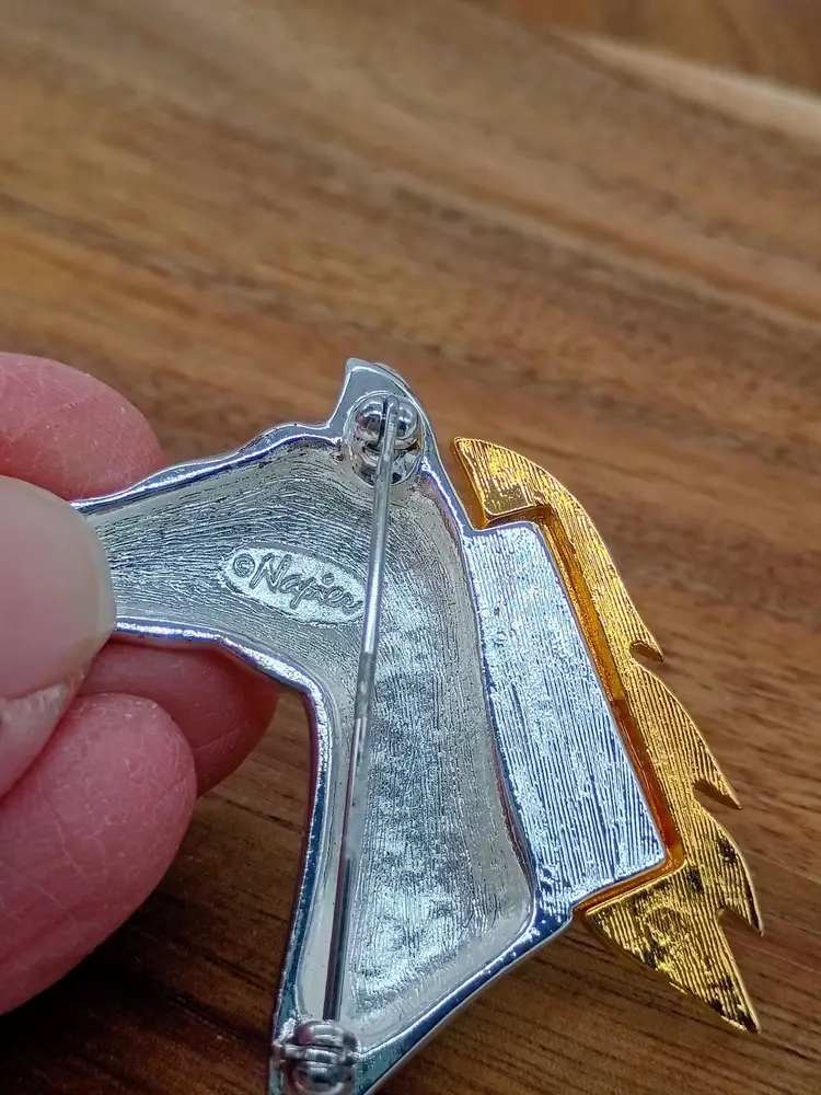 Napier Gold and Silver Tone Horse Stallion Head Brooch Pin. This is 1.75 inches. Silver tone horse with Gold tone flowing mane. This is preowned, No dents dings or oxidation on metal, Pin Back is secure and functions normally. Excellent condition. Ships USPS