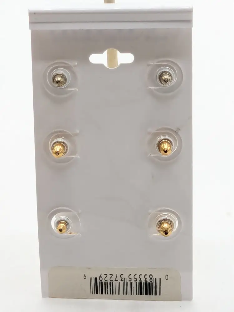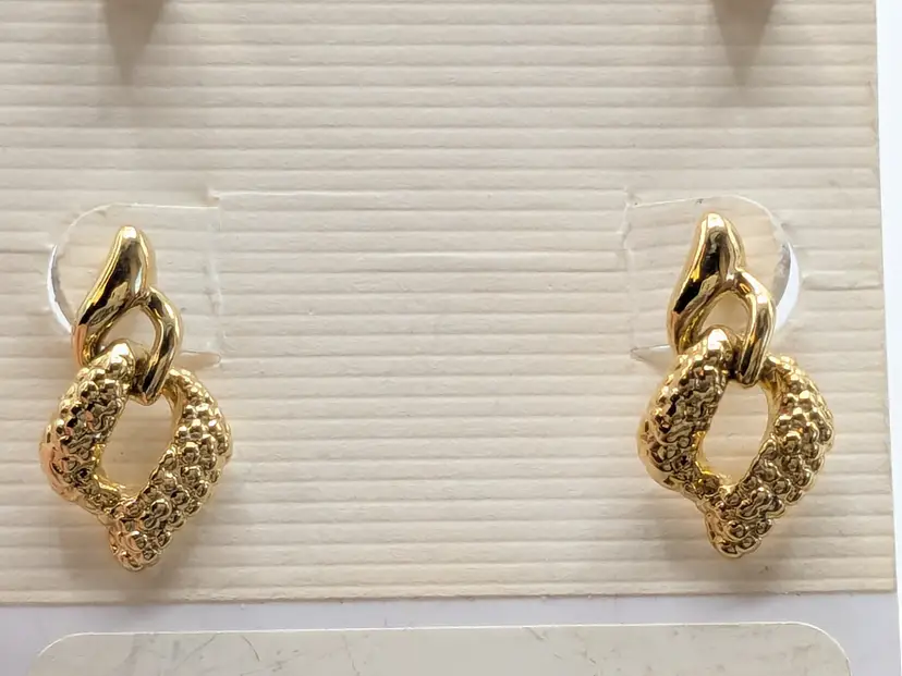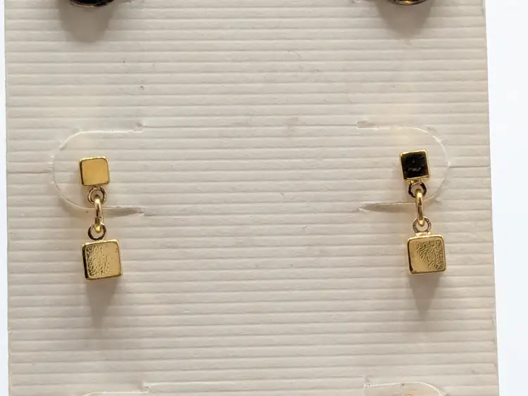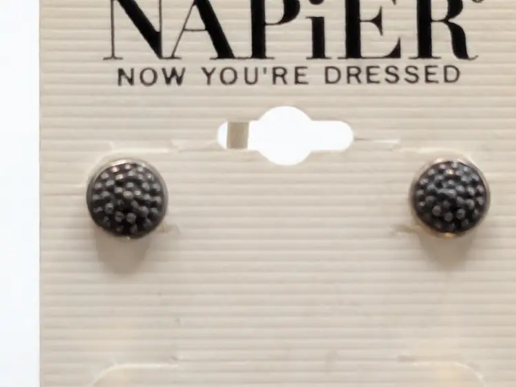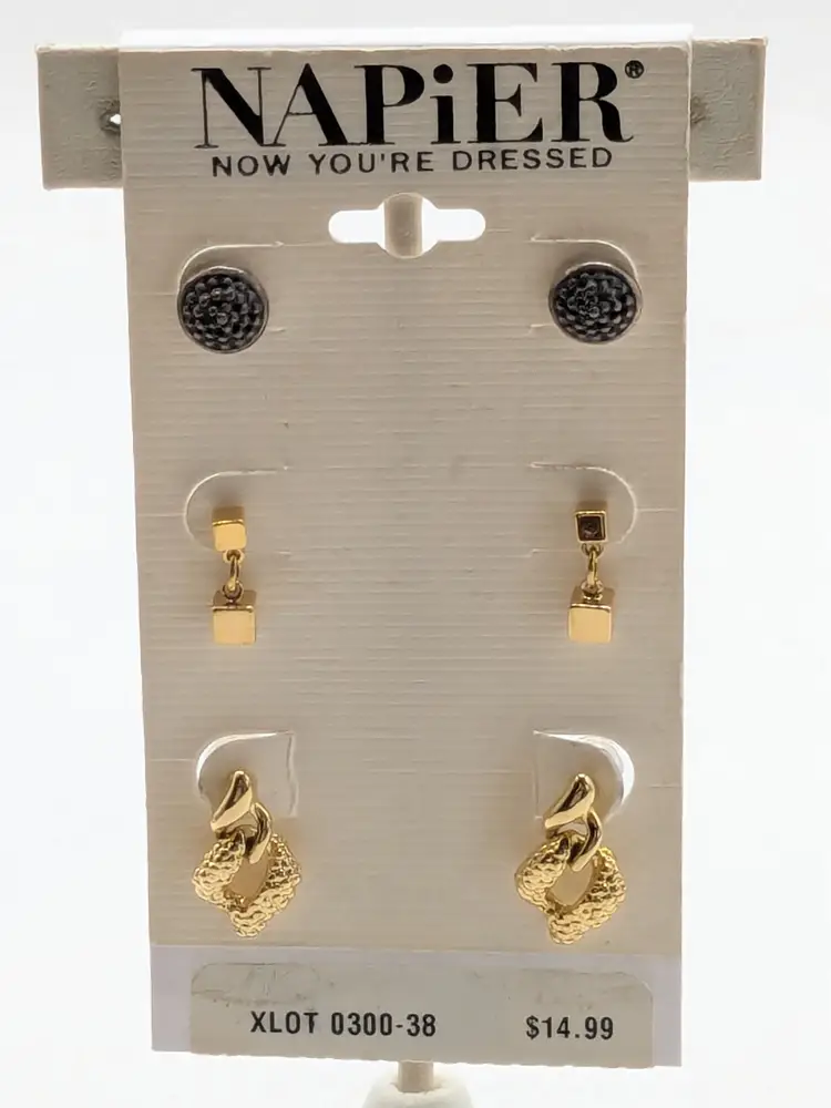 Good condition. New old stock. Set of three pairs of Napier earrings in gold and silver tones. Includes textured studs, geometric drops, and twisted hoops. Measure 3/8" -3/4". wen