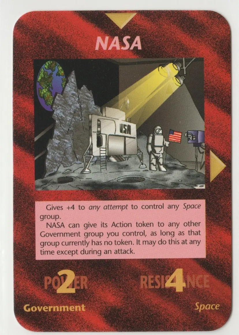 Card Size: Standard Autographed: No Set: Unlimited Store ID: American Pop Cult Material: Card Stock Vintage: Yes Rarity: Uncommon Game: Illuminati: New World Order Relevant Keywords: Government Space Language: English Card Name: NASA Manufacturer: Steve Jackson Games Country/Region of Manufacture: United States Finish: Regular