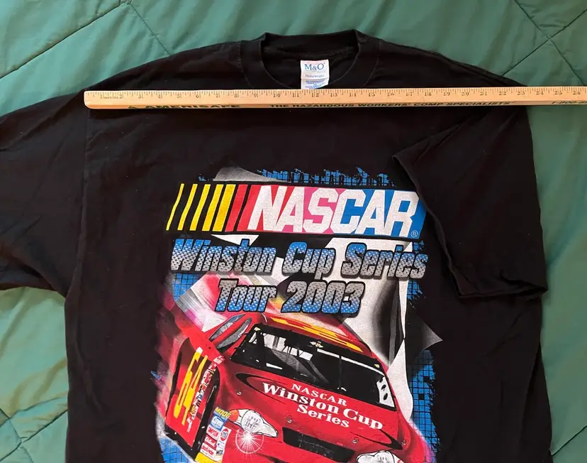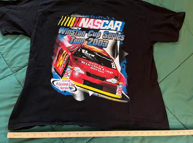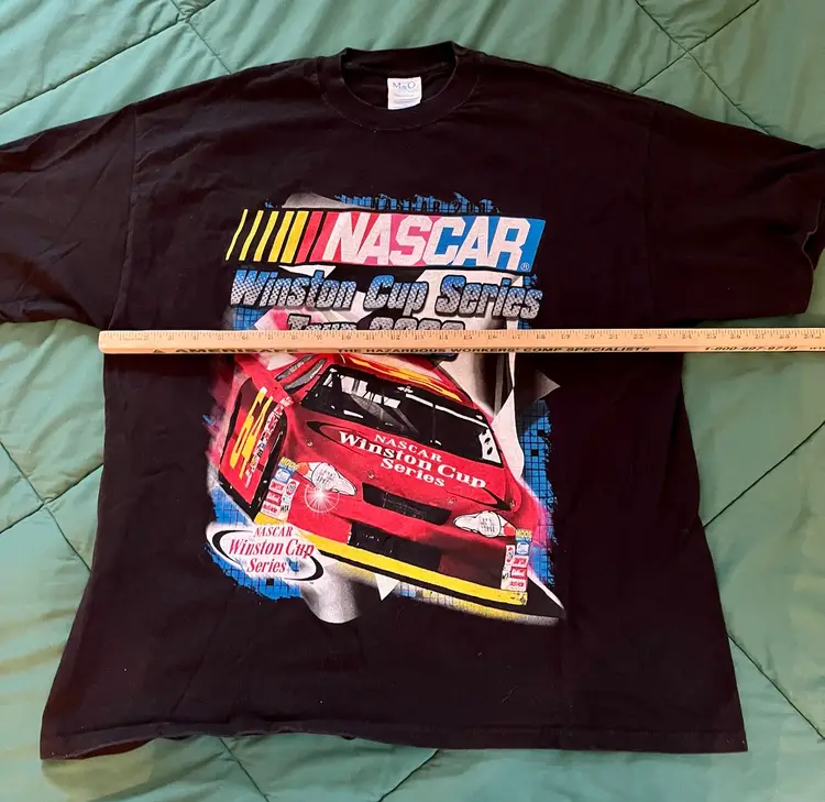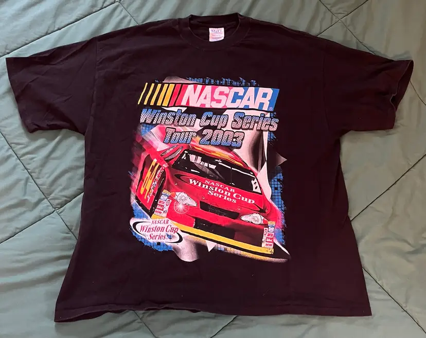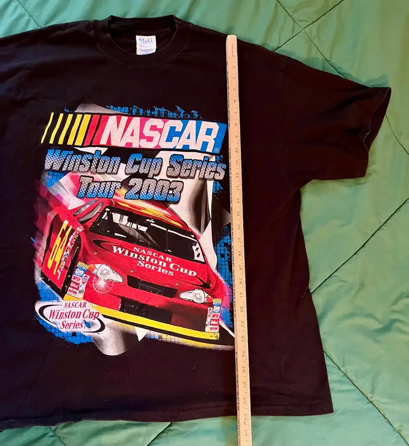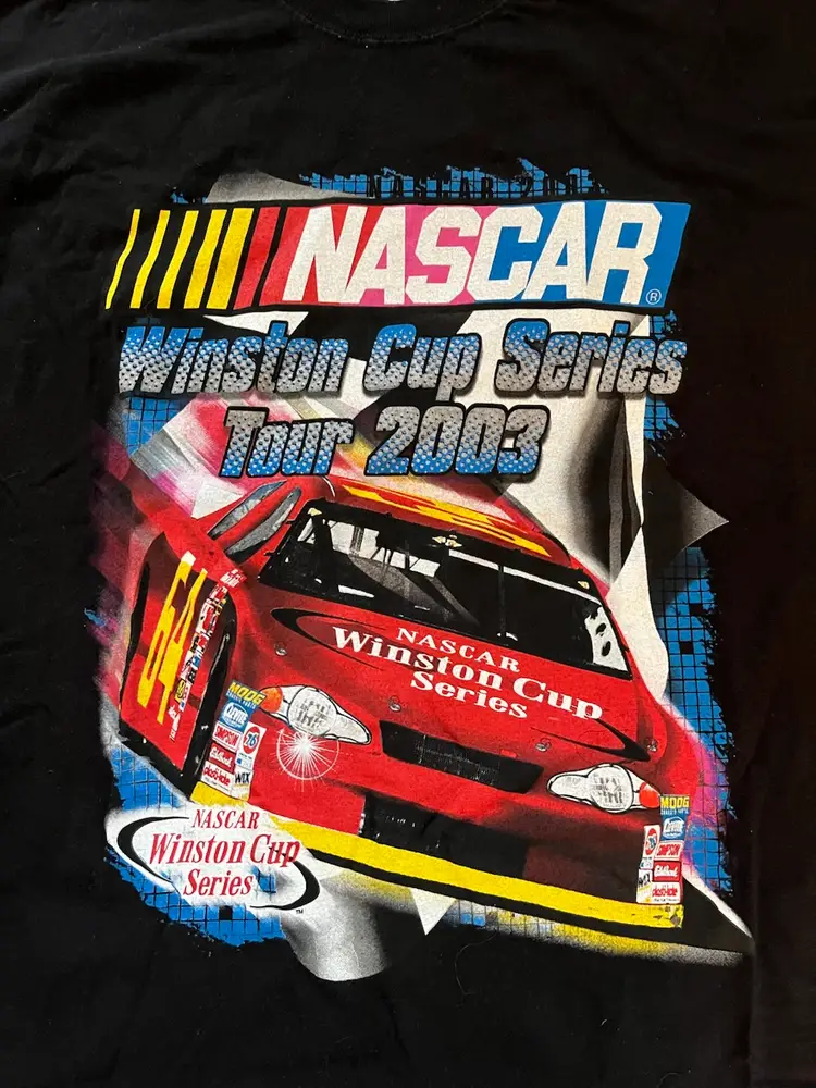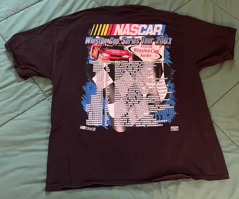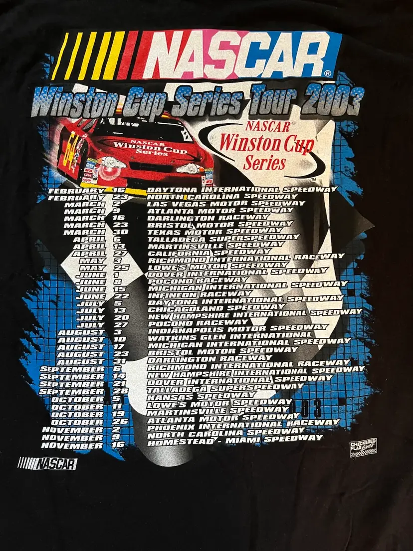 NASCAR 2003 Winston Cup Series Tour T Shirt XXL Black Double Graphic M & O Knits Heavyweight 100% Cotton. Made in Mexico. Daytona, Michigan, North Carolina, Las Vegas, Atlanta, Darlington, Bristol, Texas, Talladega, Martinsville, California, Richmond, Lowe’s, Dover, Pocono, Infineon, Chicagoland, New Hampshire, Indianapolis, Watkins Glen, Kansas