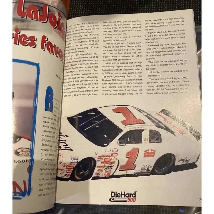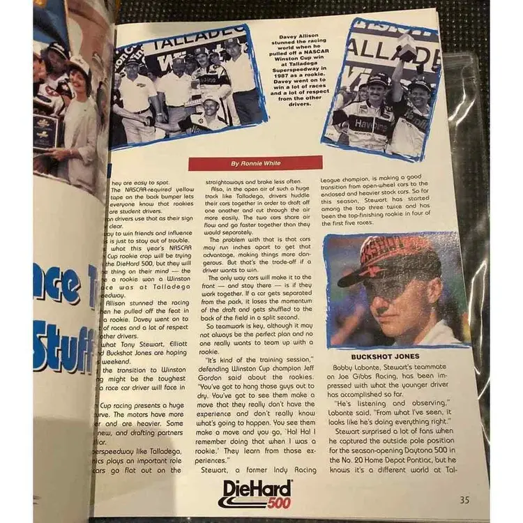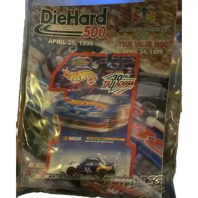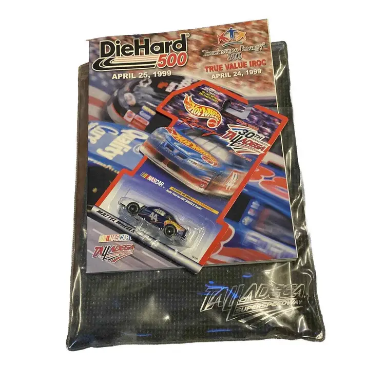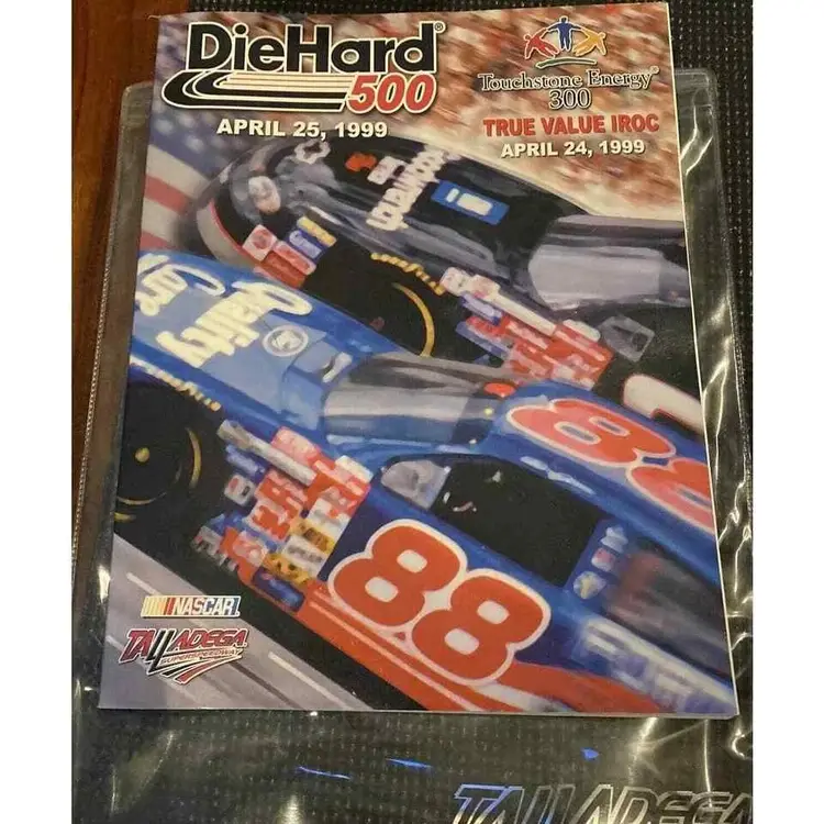 Get your hands on this vintage NASCAR Talladega Diehard 500 program, complete with a plastic sleeve to keep it in great condition. This program is from the April 1999 race and includes a 1/64 scale car for the ultimate fan experience. Whether you're a collector or just a fan of the sport, this program is a must-have for any NASCAR enthusiast. It's the perfect addition to any sports memorabilia collection and a great way to celebrate the history of this iconic race.