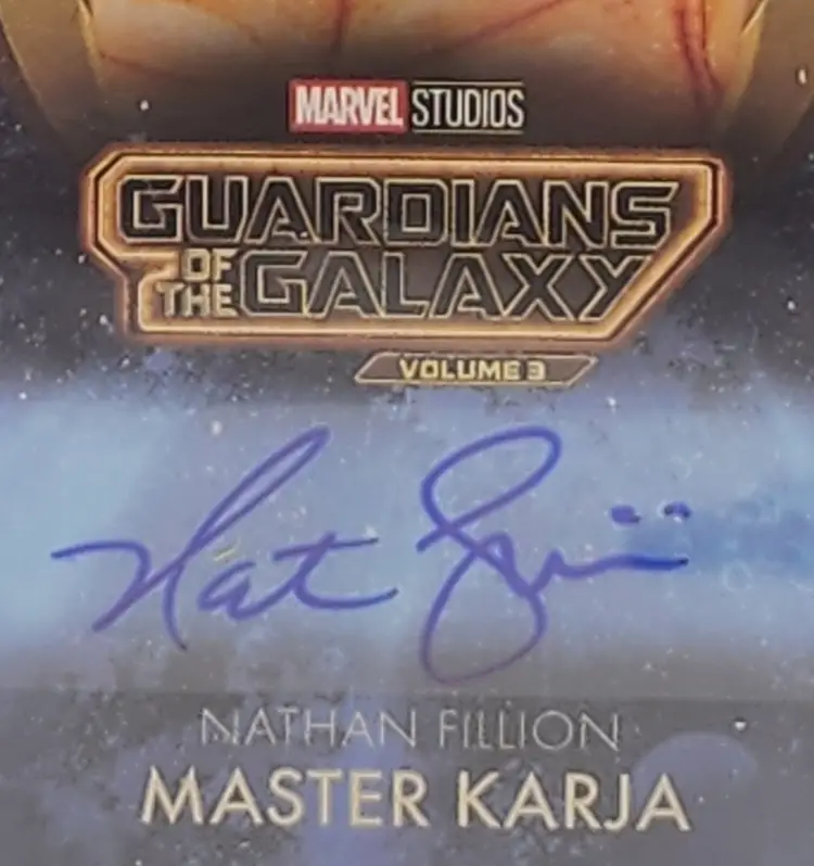 The product is a 2024 UD Marvel Guardians of the Galaxy Vol 3 trading card featuring an autograph from Nathan Fillion as Master Karja. This standard-sized card is part of the Guardian Graphs insert set by Upper Deck and is authenticated with the signature on a label or sticker. The card is made of 20 Pt. card stock and belongs to the non-sport trading card genre, particularly geared towards fans of the Marvel Cinematic Universe and the Guardians of the Galaxy franchise. The autographed card captures the essence of the character Master Karja from the movie Guardians of the Galaxy Vol 3, making it a sought-after collectible for fans of Nathan Fillion and the superhero genre.