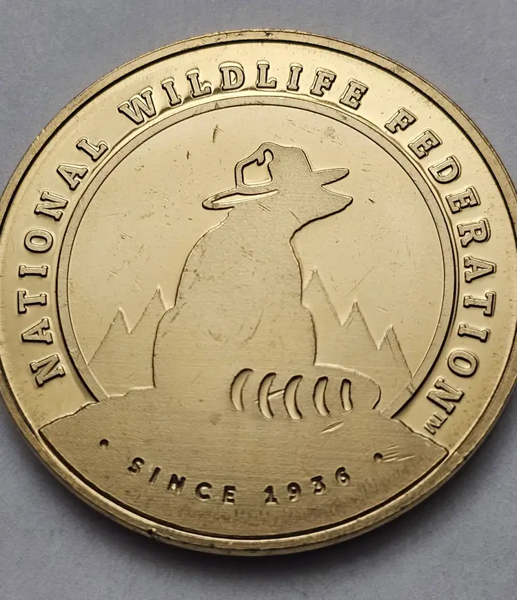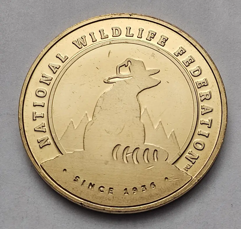 The National Wildlife Federation Since 1936 Bison Brass Medal is a commemorative piece minted in the United States. Produced by the Wildlife Federation, this brass medal features a striking design of a bison, symbolizing the organization's dedication to wildlife conservation. As a circulated item, this medal holds historical and sentimental value for collectors and enthusiasts alike.