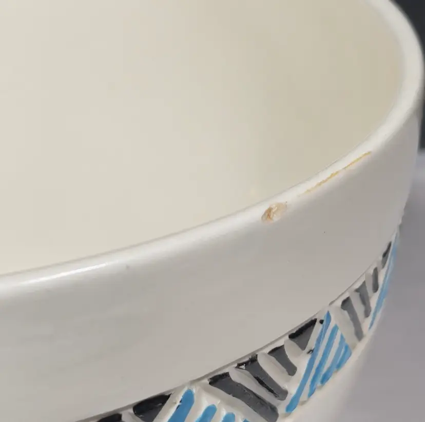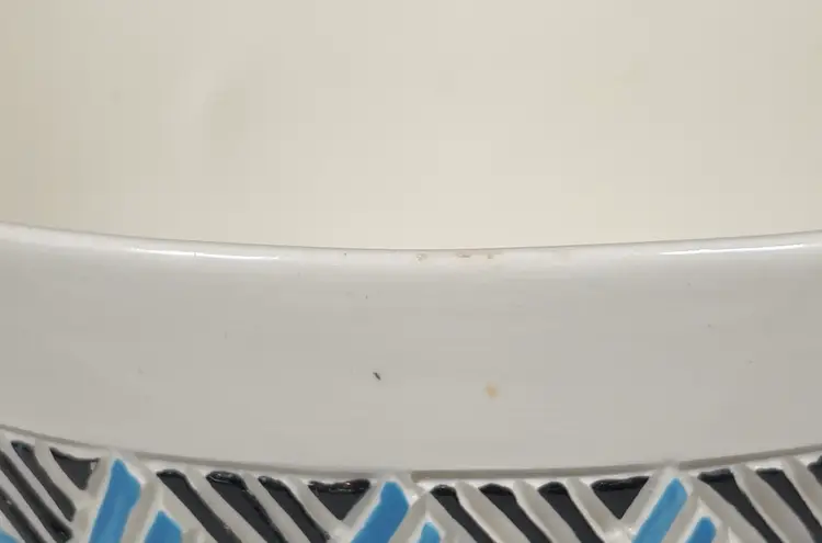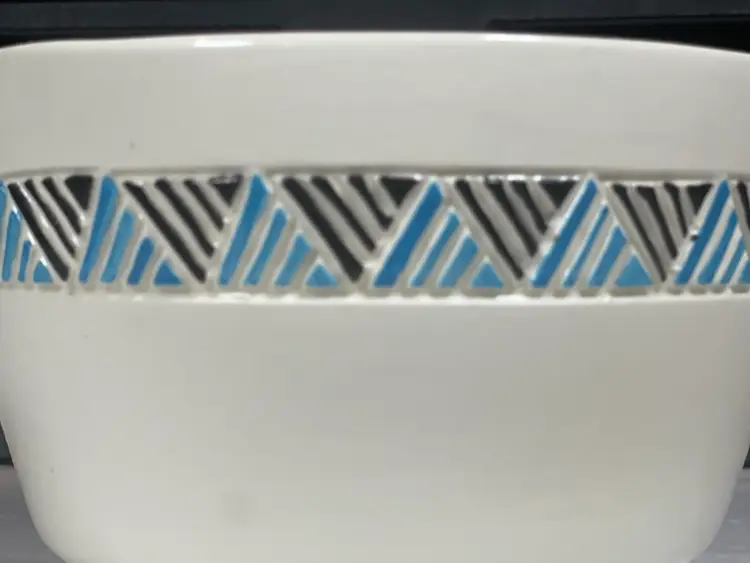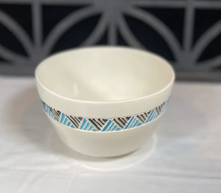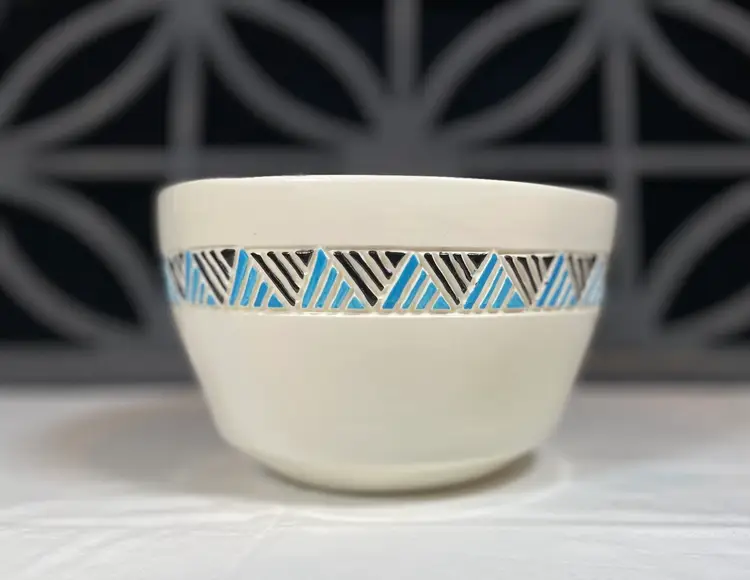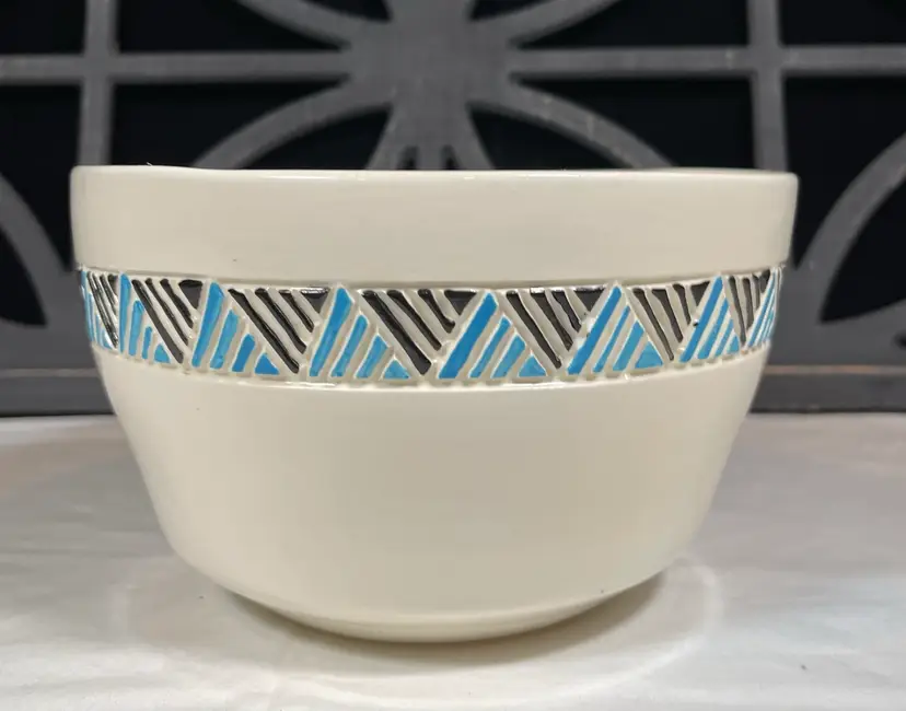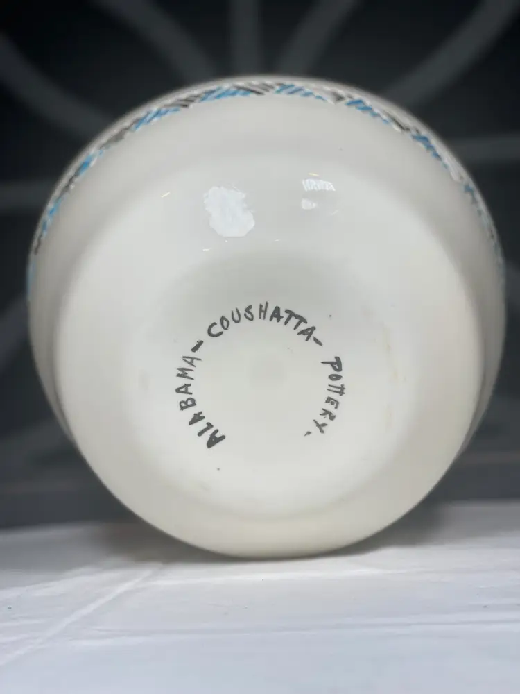 Crafted by the Native American Coushatta Tribe from Alabama, this pottery bowl is white with a band in two shades of blue encircling the sides of the piece. It is marked on the bottom and is in excellent condition with no chips or cracks.