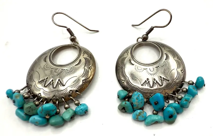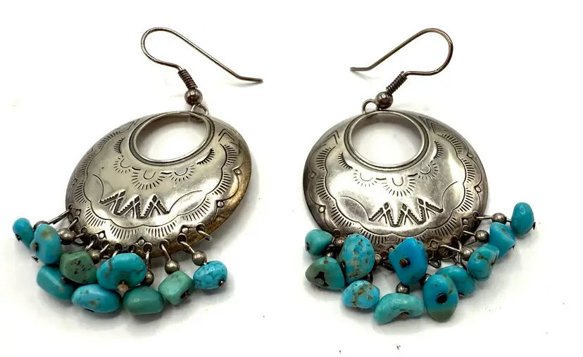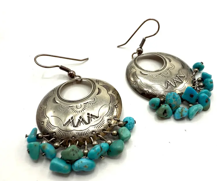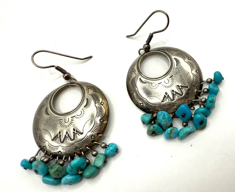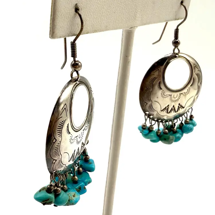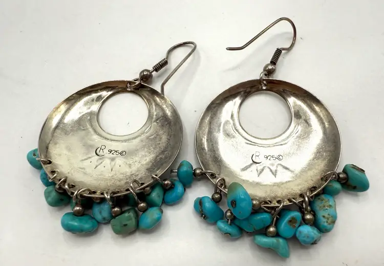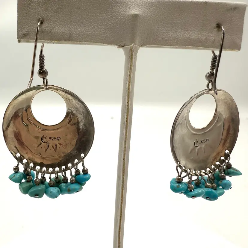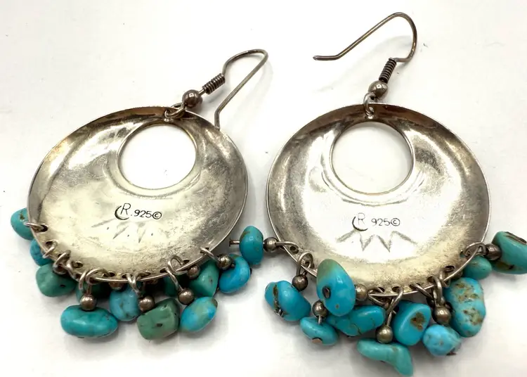 These vintage Native American sterling earrings feature turquoise stones dangling from a sterling silver setting with etched NA symbols. Signed on the back with silversmith logo. Sterling turquoises earrings are all the rage and this pair is a wonderful example. Hallmark: 925 R Size: 2 inches Long by 1 1/4 inch wide Condition: vintage excellent