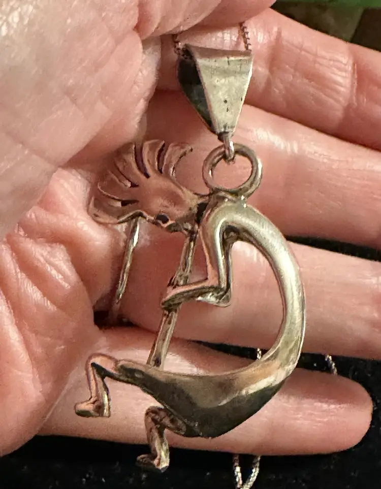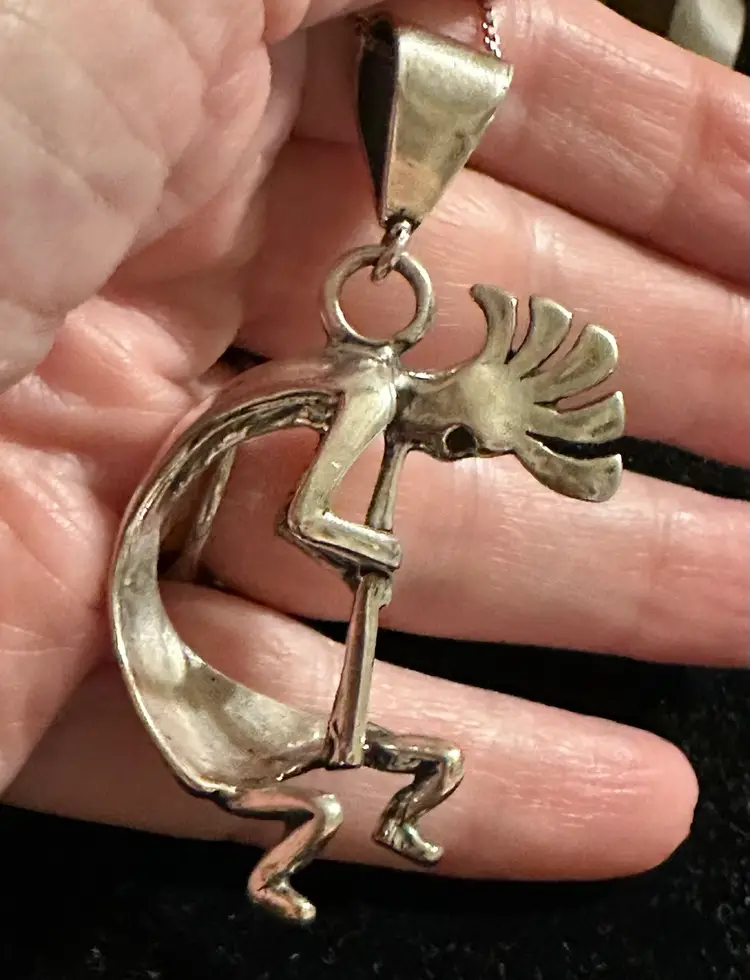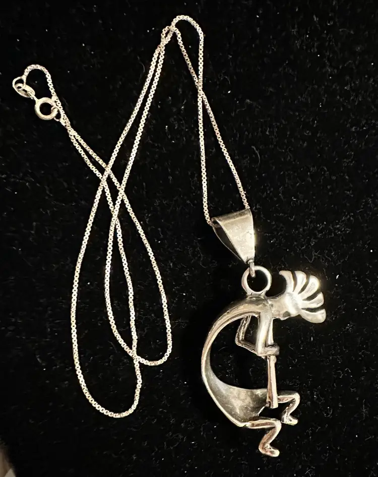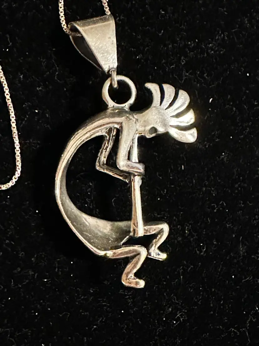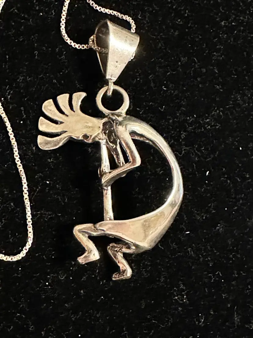 I’m Native American Hopi sterling silver Kokopelli pendant necklace. The pendant is 2.5”, the box link chain is 22”. Excellent condition.