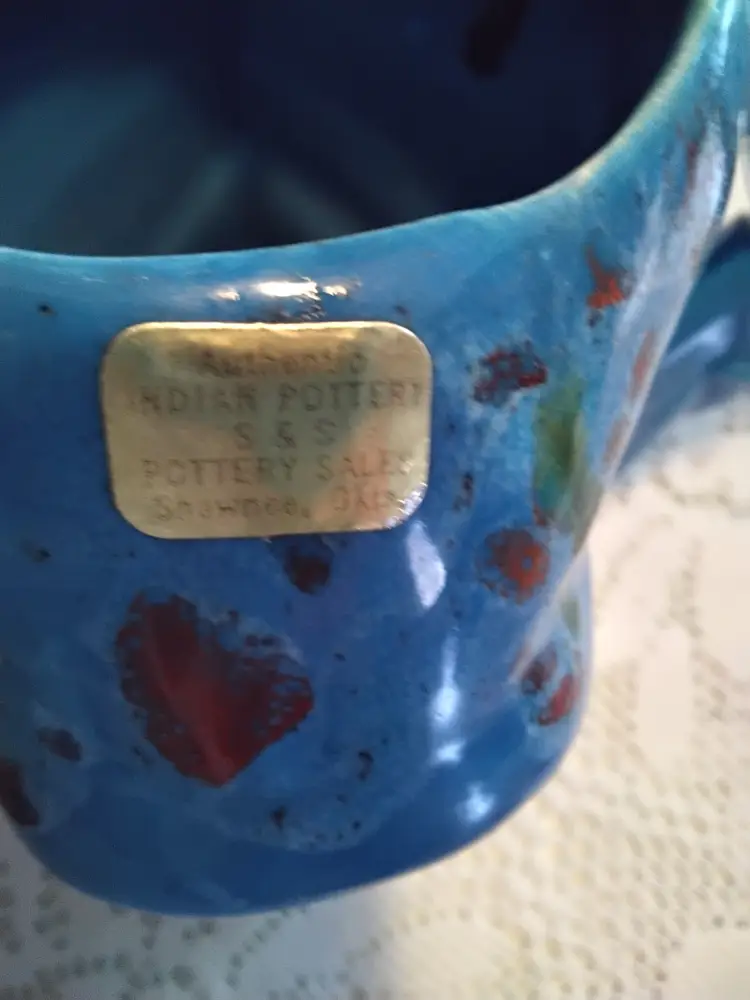 Vintage Native American Indian Head Mug Ceramic. Colors are Red, Green, over Blue. The word Creek on bottom of Mug. 5 Inches tall and 7 inches wide. Holds around 16 ounces. Original sticker on mug. Mug is in good condition with no chips or cracks. Photos are part of the description.