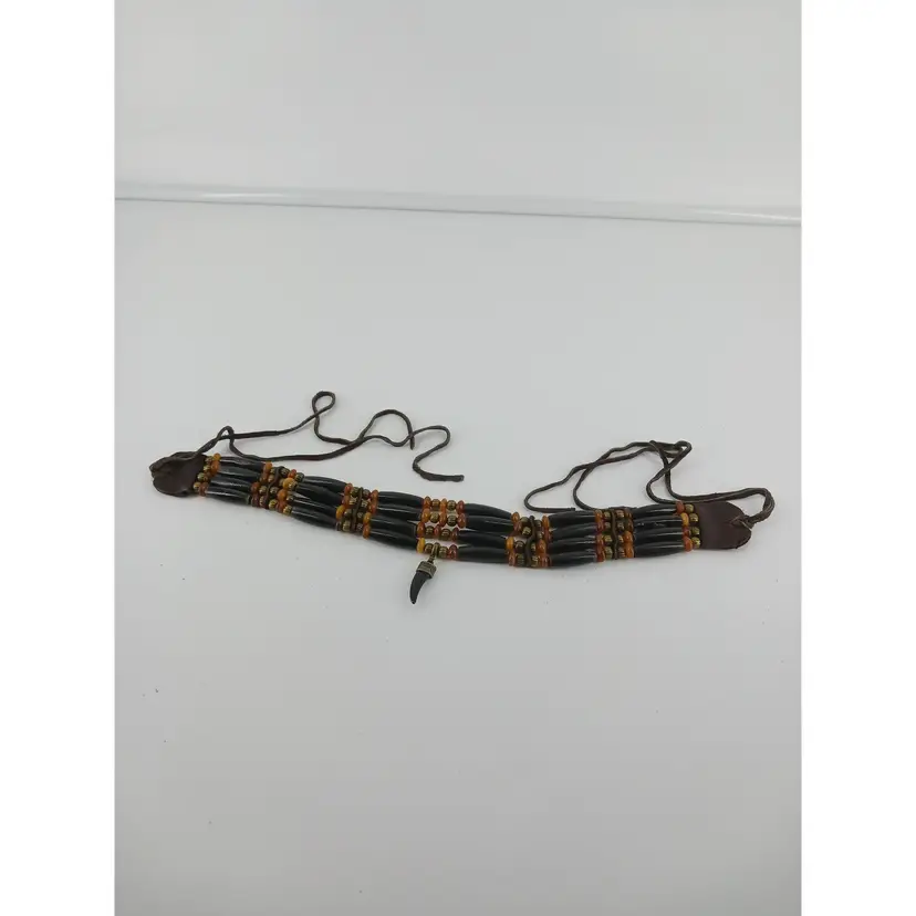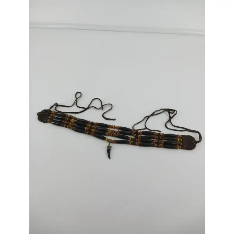 NAN-1511 – Four rows of 1" x 5/16" approx. black Buffalo Bone hair pipe beads have been strung with sinew and are separated by Amber Bone beads, bronze spacer beads, and dyed brown Elk Hide to make this choker. Choker measures 13 inches from each Elk Hide end and has 11" long hand-cut Elk Hide ties. A 1 x 3/8 inch black carved tooth set into a bronze setting hangs from the center of the bottom row of hair pipe beads.