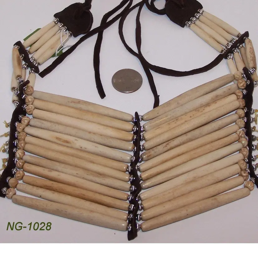 NG1028 – Native American chest plate is made from buffalo bone hair pipe bones. Twenty four 3 inch pipe bones along with carved bone beads and silver plated spacer beads make up the main body of this piece. Sixteen 1 ½ inch pipe bone along with dyed brown elk hide has been used for spacers in this 17 inch breast plate. Approx. 9 inch leather ties are on both ends.
