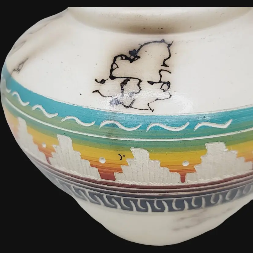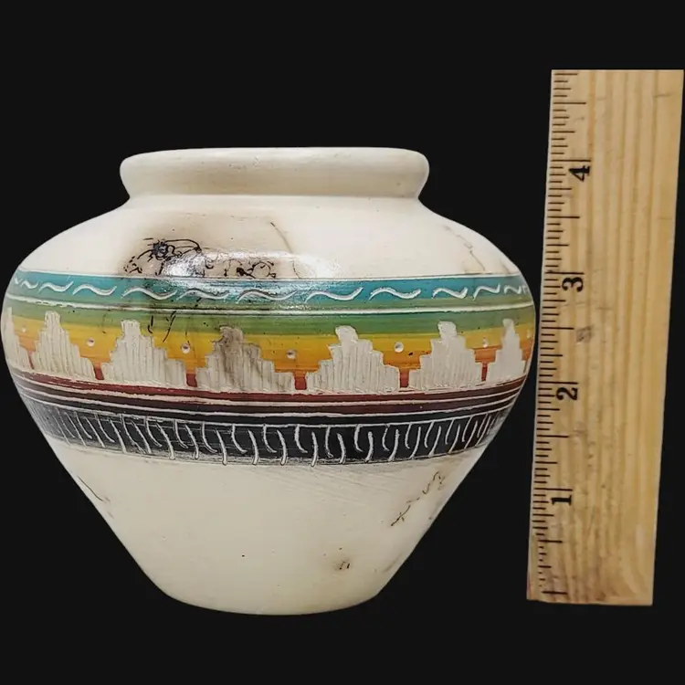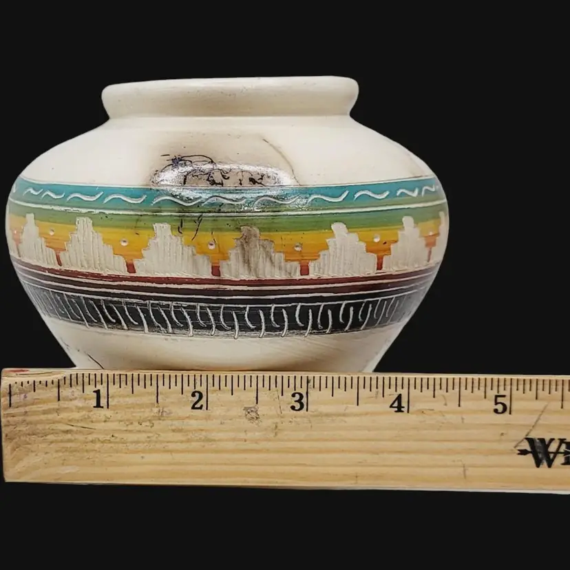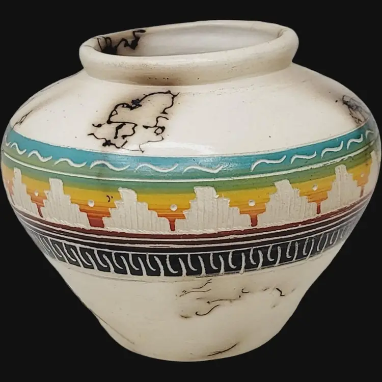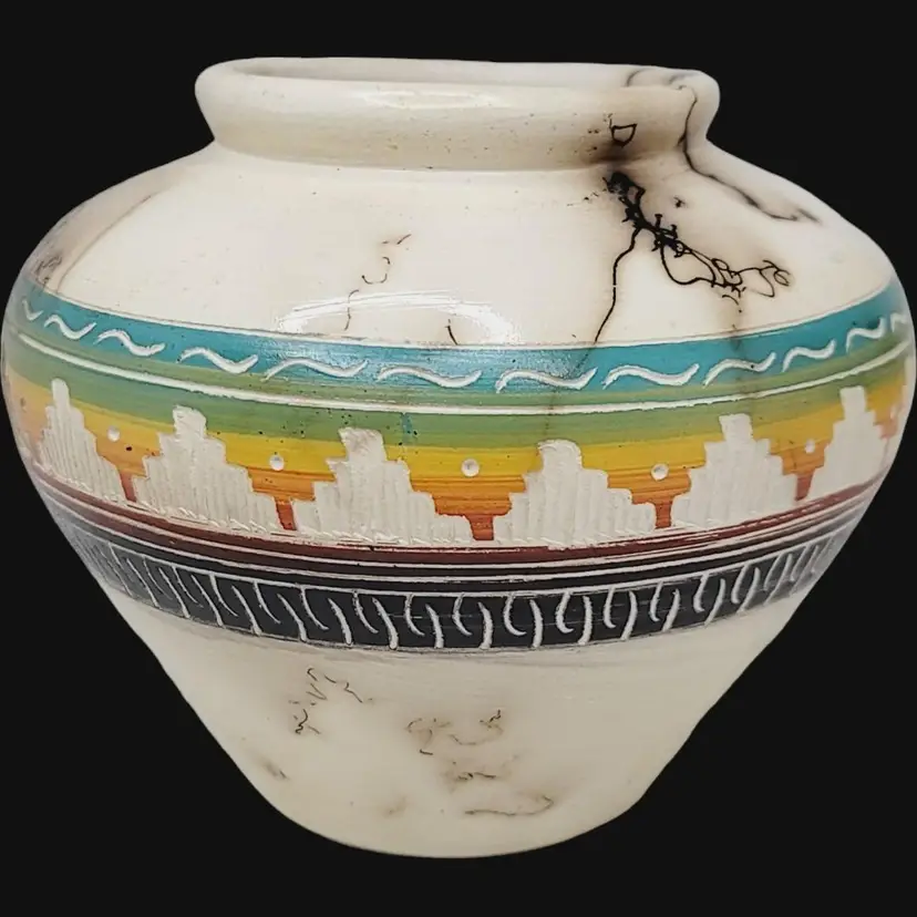 Native American Navajo Pottery 4" Etched Horse Hair Rainbow Vase Signed